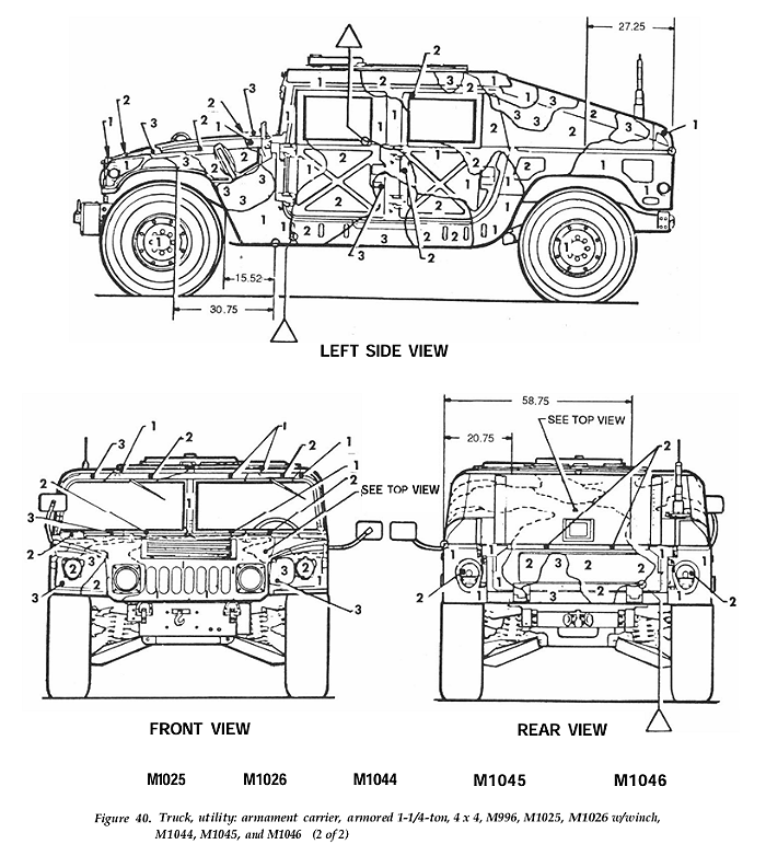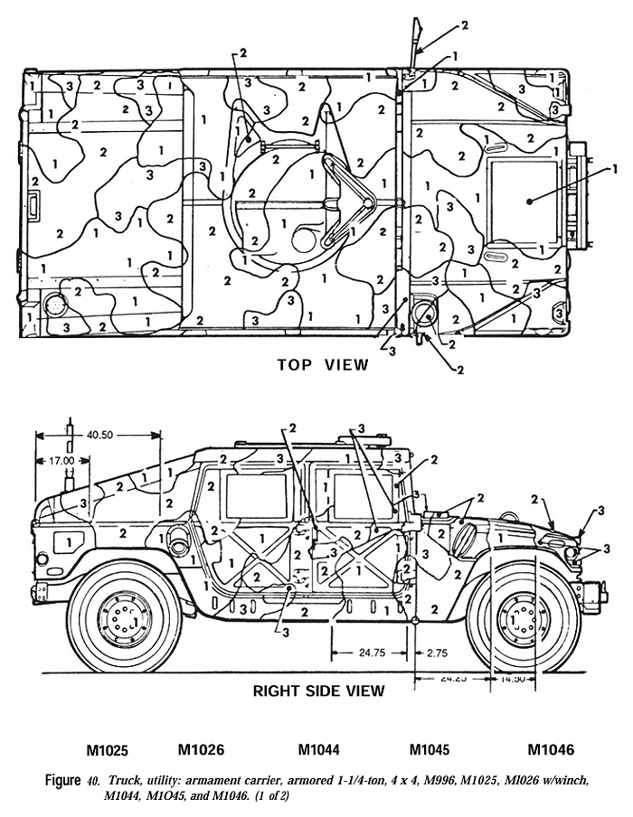 Camouflage patterns, when painted on a military vehicle, are a guide for a design developed for the specific item of equipment. The design is an outline drawing of the item on which wavy lines give the boundaries of the color areas. Within each such area is a number that stands for the color to be used in that area, except that areas which are to be black are shown as solid black. As can be seen from the chart on the Military Vehicle Camouflage Page, the color represented by the number varies according to the seasonal or terrain color combination being used. An individual design drawing is given for each of the five views of the vehicle: front, back, left side, top, and right side.