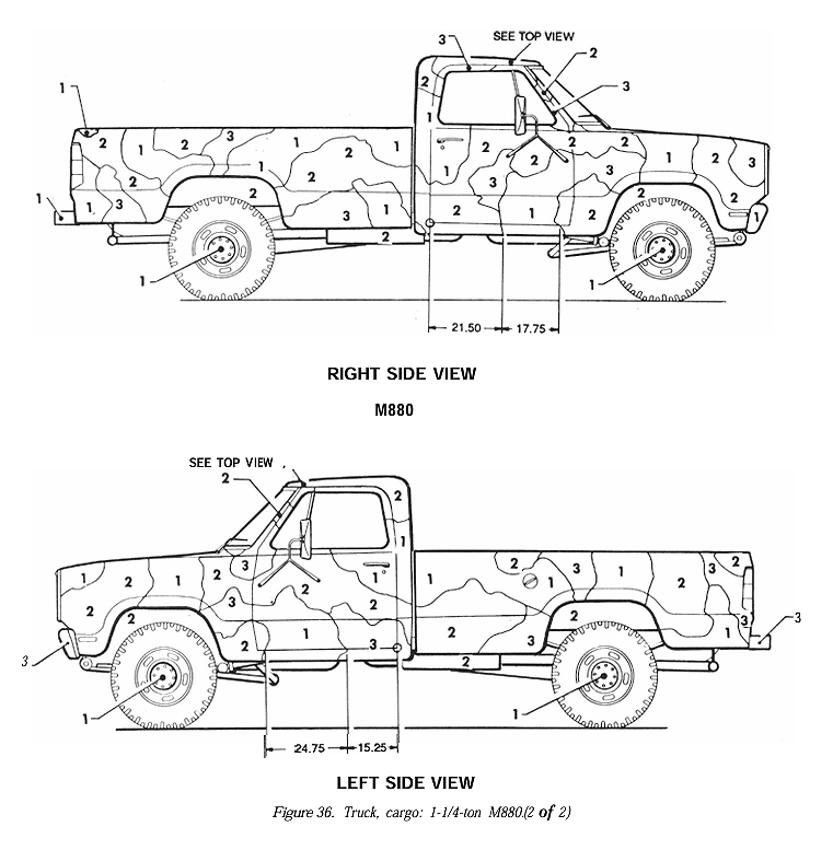 These patterns are from TB 43-0209, Color, Marking and Camouflage painting of military vehicles, construction equipment, and materials handling equipment, published by the Department of the Army. For each version of CUCV (pickup, utility, and ambulance) there are the original patterns, and the revised pattern which is to be used if the vehicle is completely repainted.