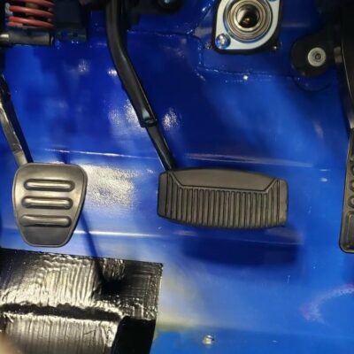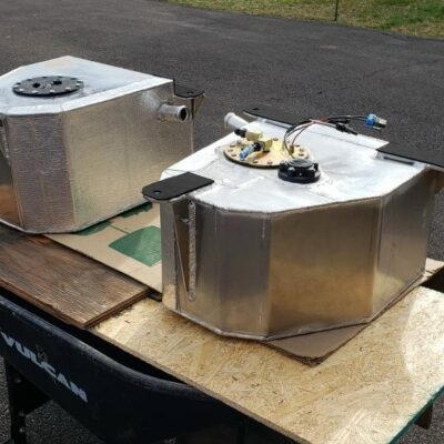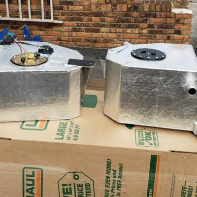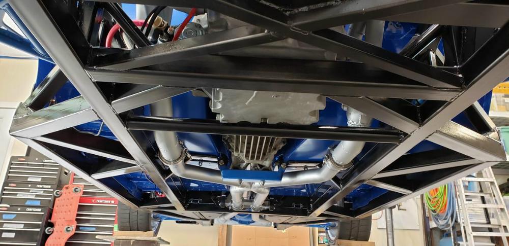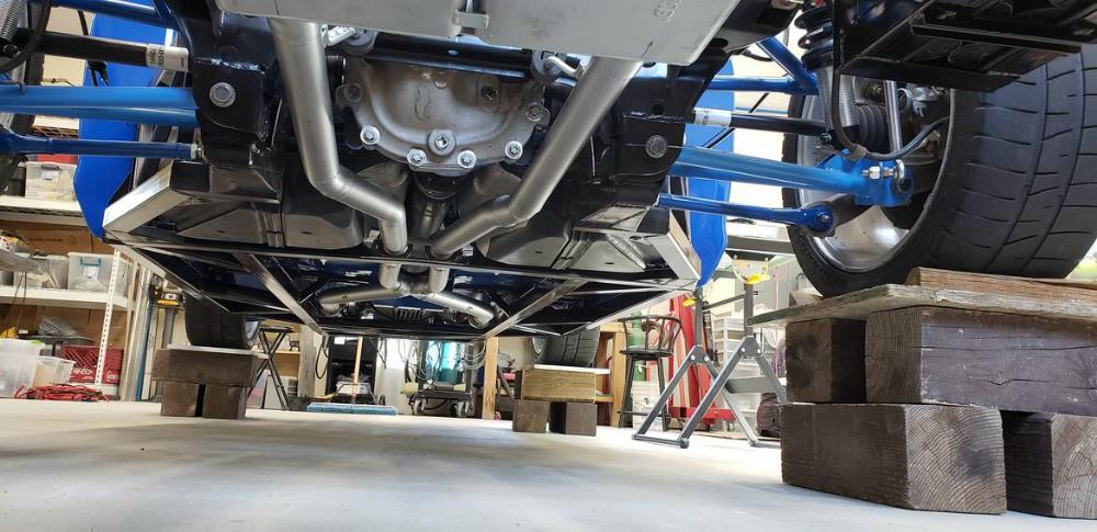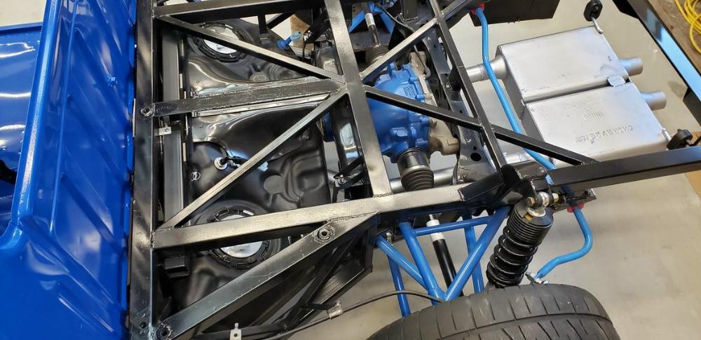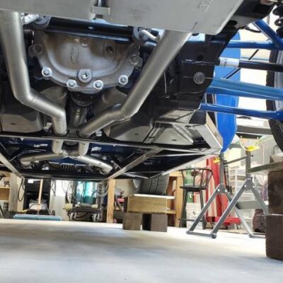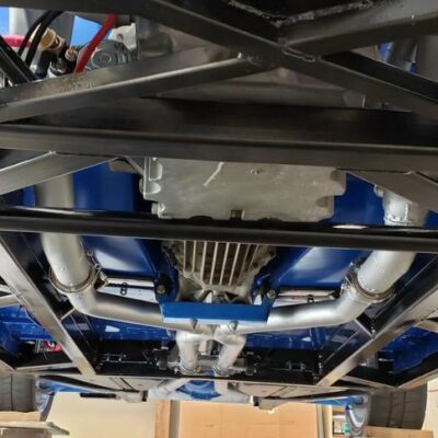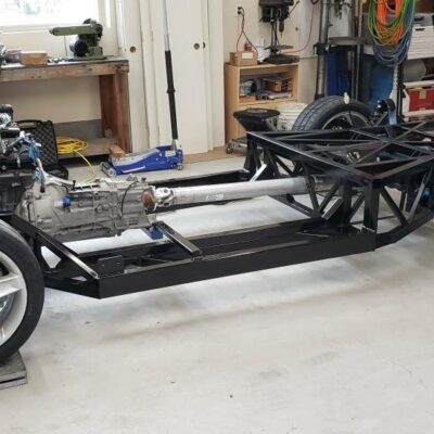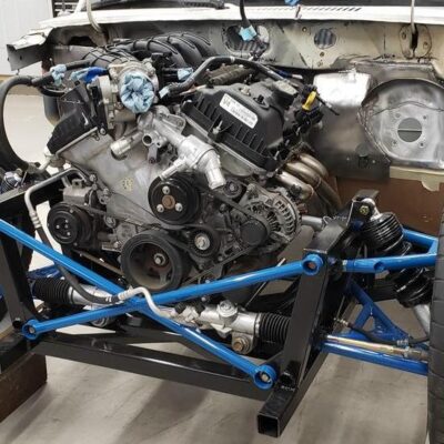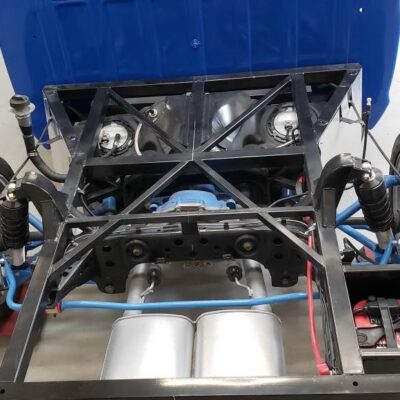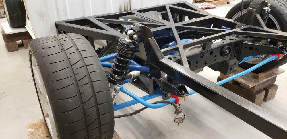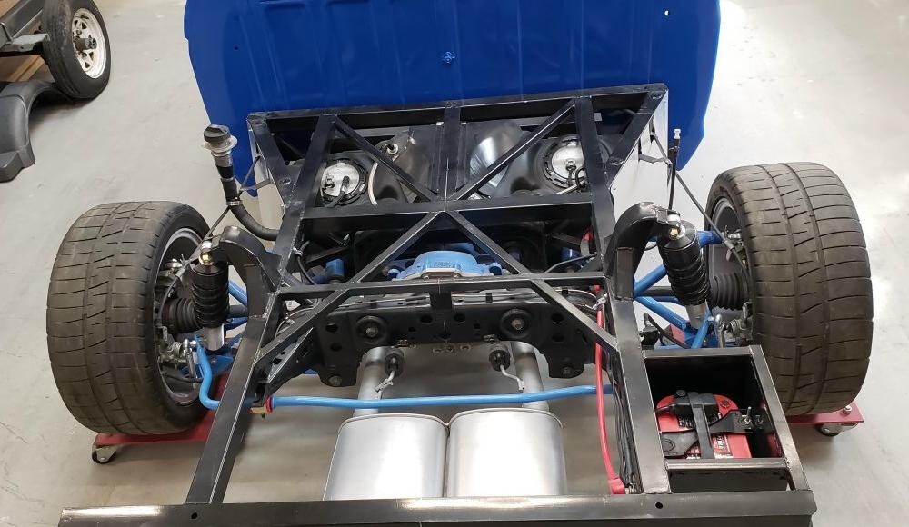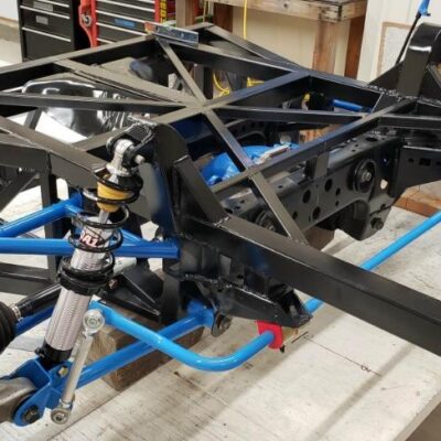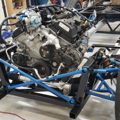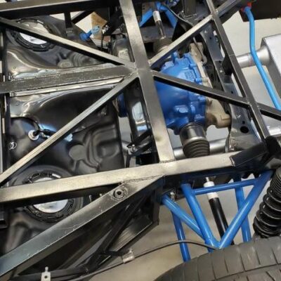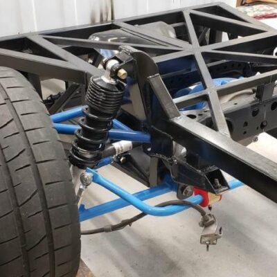 The coilovers are single adjustable twin tubes QA1’s. Jim says he’s used these QAI’s for years and that they work well on smooth surfaces. The Ford 8.8 IRS rear axle is from a 2017 Ford Mustang.