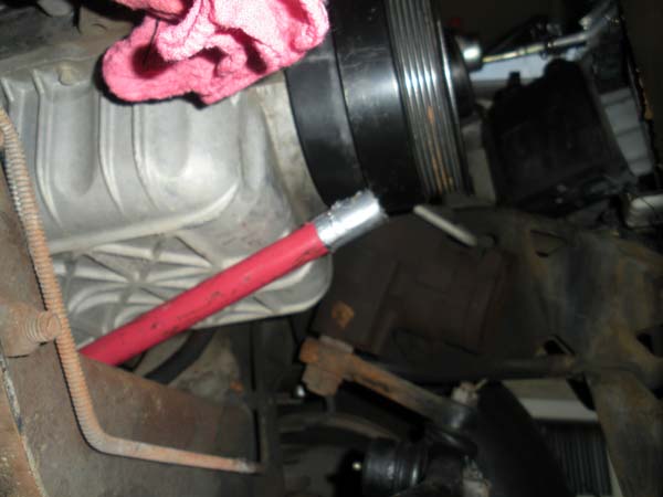 Ok, this is where Haynes says "remove the crank shaft pulley", but they don't tell you what a bitch it can be. First take out the bolt. If you have an impact wrench, sweet. Sense you took out the radiator you wont have a problem using it. If you are like me and don't then you need to get creative. just spinning it to the left is futile. There are a lot of ways to do it and they all can be found in this forum with a quick search. I just put my breaker bar on it, tied it to the frame with a tie down strap and with the ignition coils disconnected, cranked the engine for a half second. Worked like a charm.