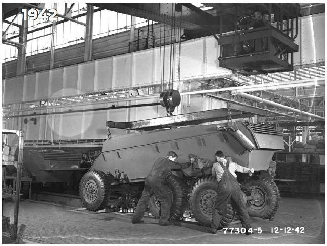 1942 – First T-17 medium armored car produced. Other war production includes M8 armored cars, trucks, tractor bearings, and parts for Pratt & Whitney engines.