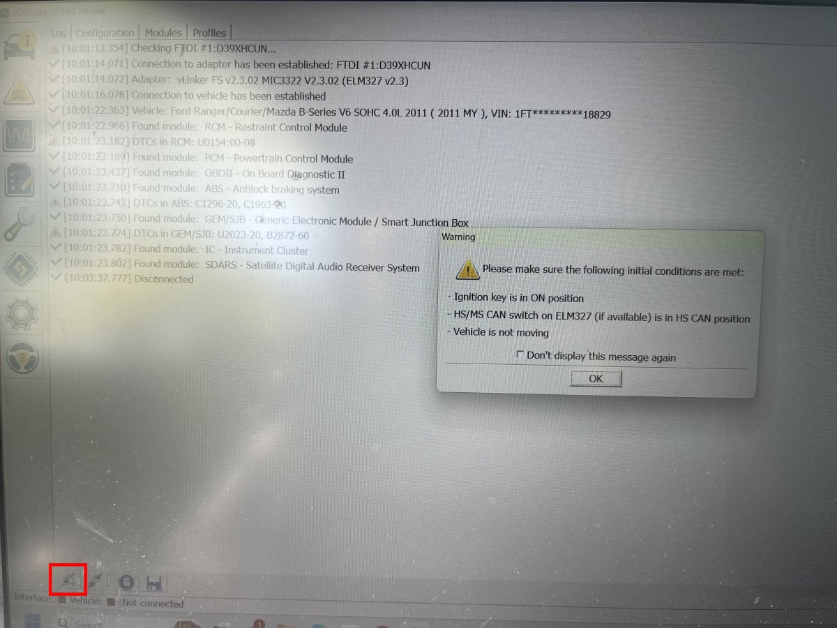 When you first open Forscan you'll press the connect button (Highlighted in Red below) in the bottom LH corner of the screen. The will tell the software to look for the truck. It'll have some pop ups and questions to answer that you'll need to click through.
