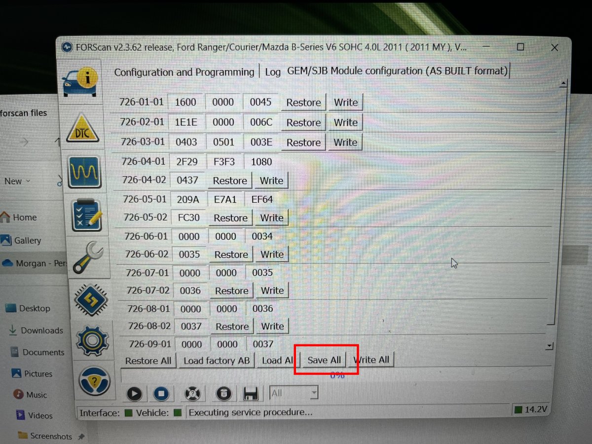 Before we do anything else, we'll want to make a backup of these settings so no matter what we can put it back. You'll press the save all button and save the file on your computer some place, give it a name like "2011 Ranger AB GEM Stock".