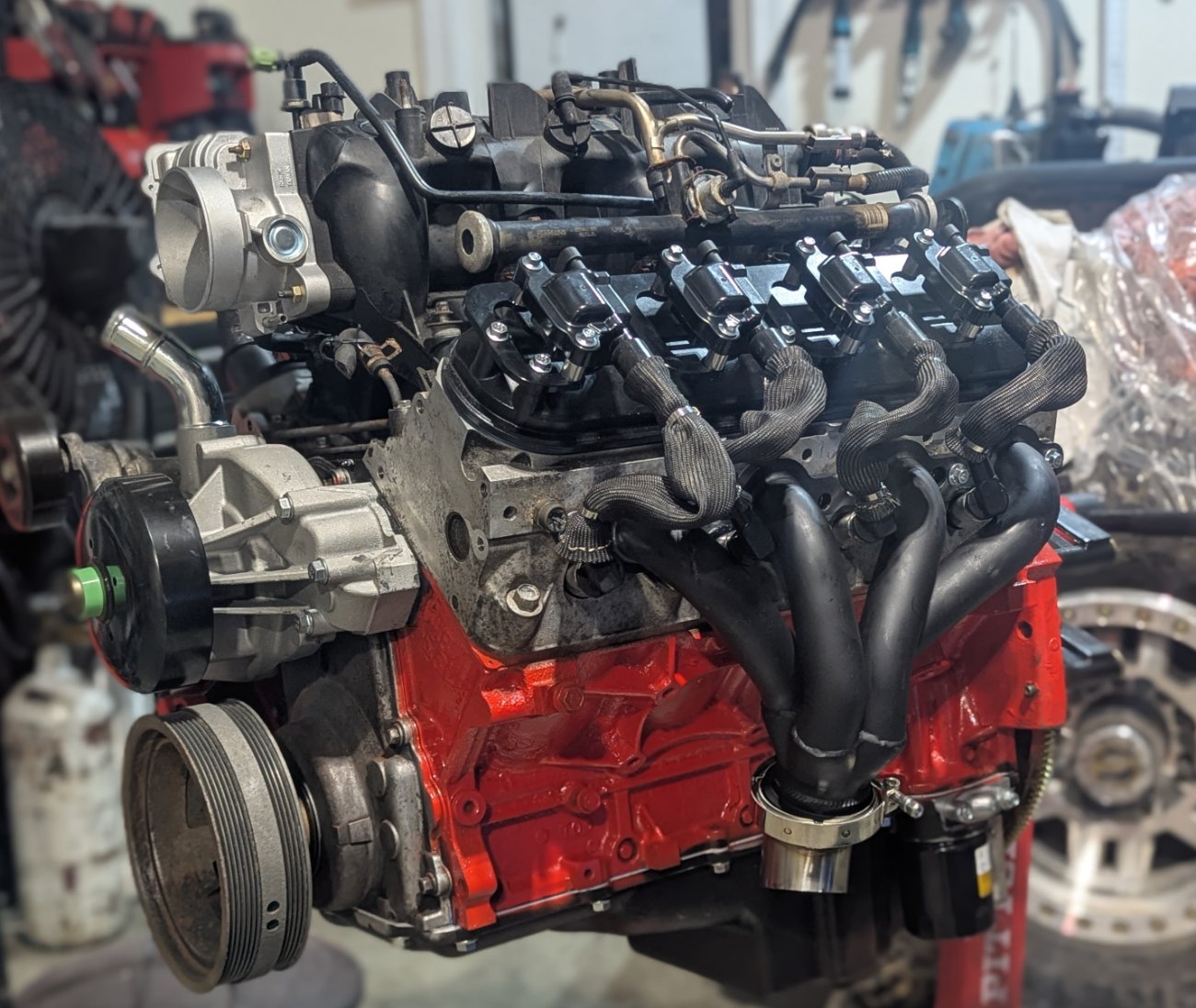 My thermostat housing finally showed up, so now the engine is as together as it's going to be for a bit. Headers are bolted on, everything below the intake is set up more or less. Will need to double check everything and make sure I caught all the sensors on the motor that needed to be replaced, but I'm reasonably happy right now with where it sits