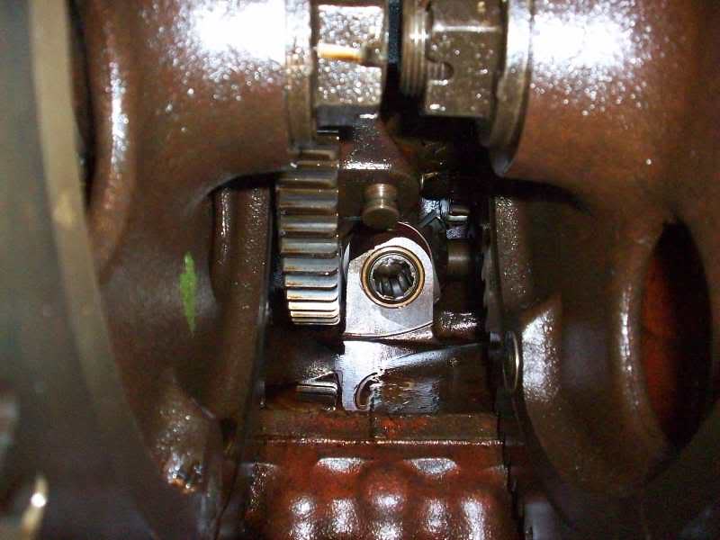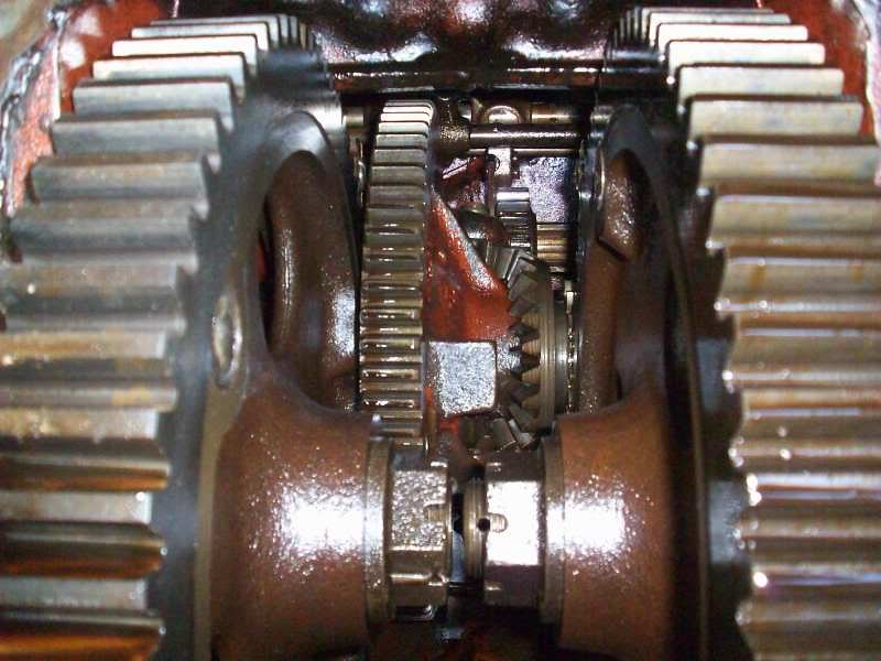 Way up in there down low, this is my '46 B (basically a 3/4 scale A) There is a stub shaft that goes from the splined socket to the shaft that comes out the back. In automotive terms that is the ring gear for the diff just to the left of it (none of that fancy swirly hypoid gear crap in here)