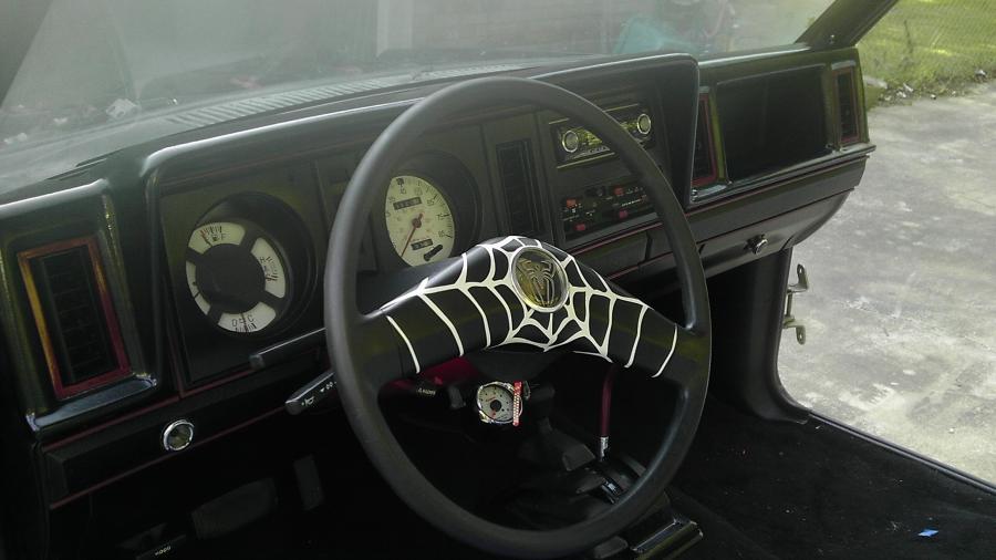 The interior will be finished off w/ custom vinyl seats that match original design, but will be black w/ white pleats and piping. The spider in the steering wheel needs some finishing touches as well; I put in a small circuit board w/ LEDs, and 9v, and a push button and the center glows when switched on.