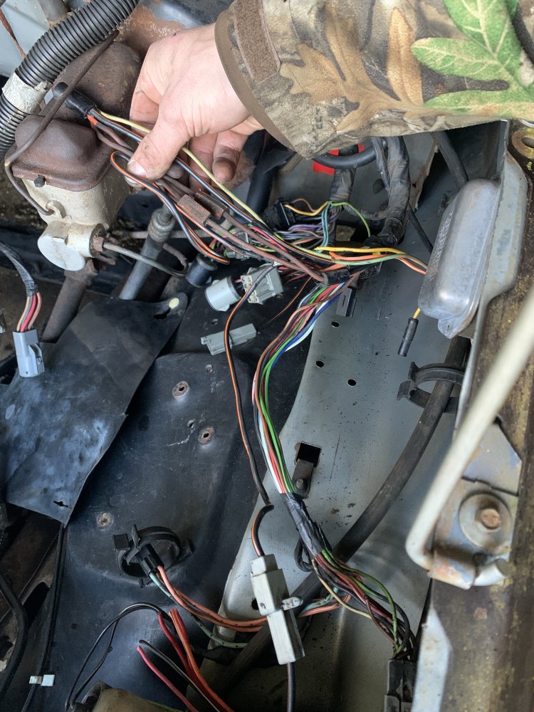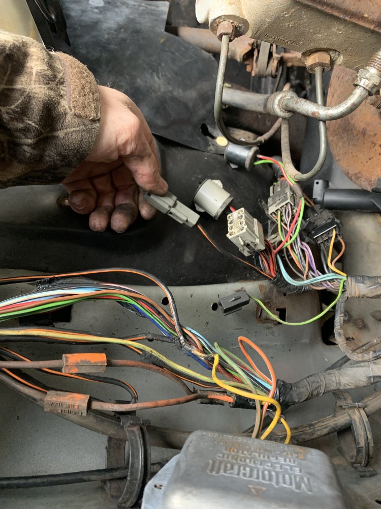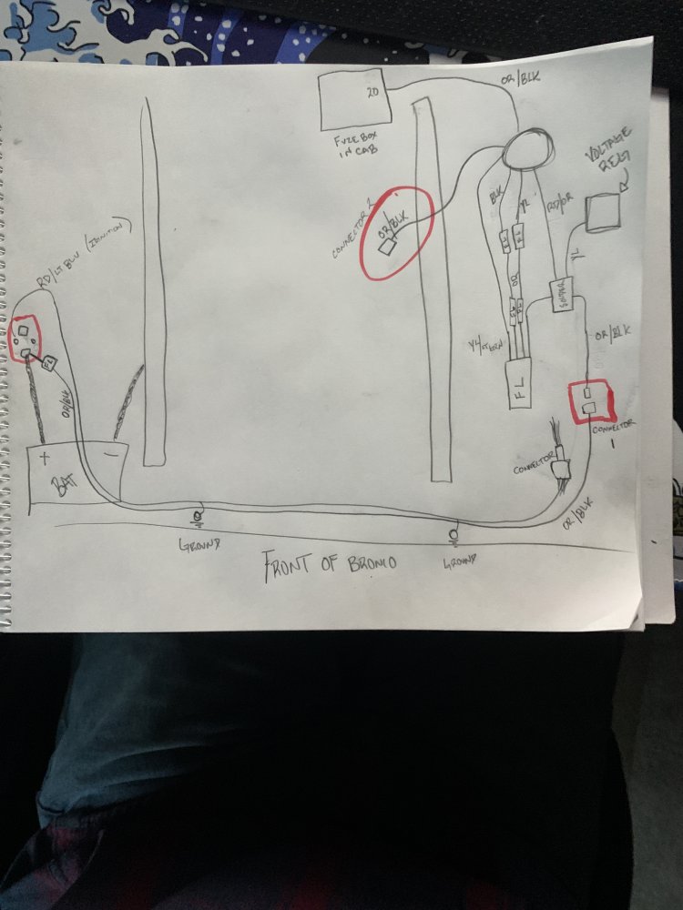 I am in the midst of swapping my 4.0 into my 85 bronco 2. Before pulling the engine, i had all lights and signals. After pulling the engine and engine harness there is no power to anything. Lights should be on an independent circuit, but nothing is working. Excuse my crude drawling but this is what the power for the accessories looks like. I will also attach the Chilton page referencing what I'm drawling. The first picture is the main power connector for the lights, Orange/Black. When I disconnected the left side (headlight side) the wire has full battery power. When the connector is reattached but the headlight pull switch is off, it reads around 4-5 volts. And finally, when I pull the headlight switch, it drops to 0 volts everywhere besides the starter solenoid. I checked the fuse's and they were in working condition, however when the headlight switch is disengaged the fuse reads 10.5V and climbing. All fusible links visibly looked good. In regards to my 3rd picture, it is the same connector as the first picture but it doesn't have anything to plug into. I checked the 2.8 harness and couldn't find a matching wire. The last two pictures is the wiring diagram. Connector 1 and 2 when headlights are "off" reads 4-5V. Lastly, when i pulled the engine harness for the 2.8 I made sure not to cut anything related to the body. Its making me crazy, my best guess is the headlight switch, but i am not sure how that would of gotten buggered up. Hopefully one of yall are electrical engineers, not my fancy yet. Thanks!