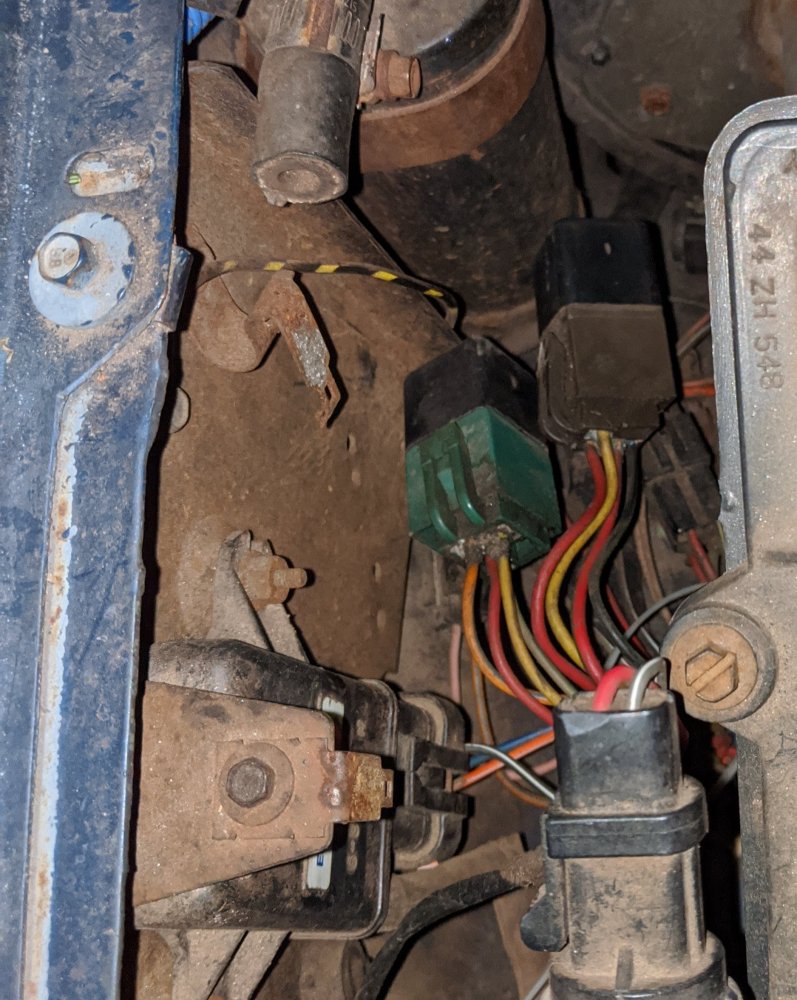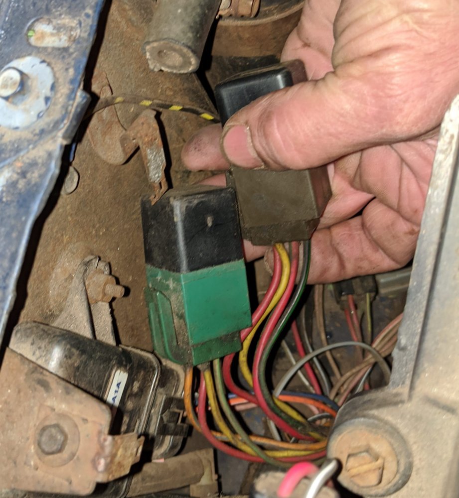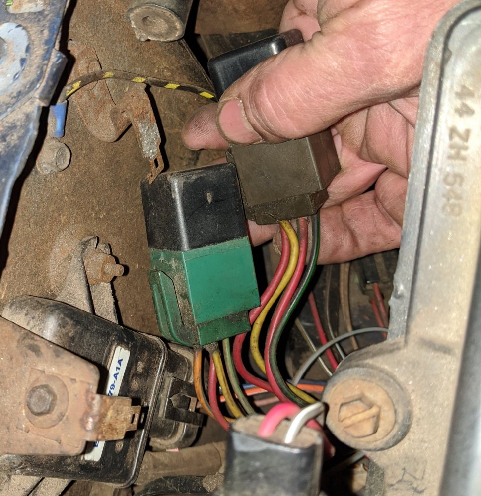 View attachment 34655View attachment 34655View attachment 34656View attachment 34657 spinning. The fact that I hear absolutely nothing may point to the relay but, I am wanting a little confirmation I'm on the correct track. Pictured are the relays the inside of the passenger-side front fender. They don't have any markings on them and the grooves that the mounting tangs slipped into have broken off (perhaps part of the problem). Does anyone know if the fuel relay is the green one or the brown one pictured here? Am I deducing correctly? How should I go about testing to see if it's the relay?