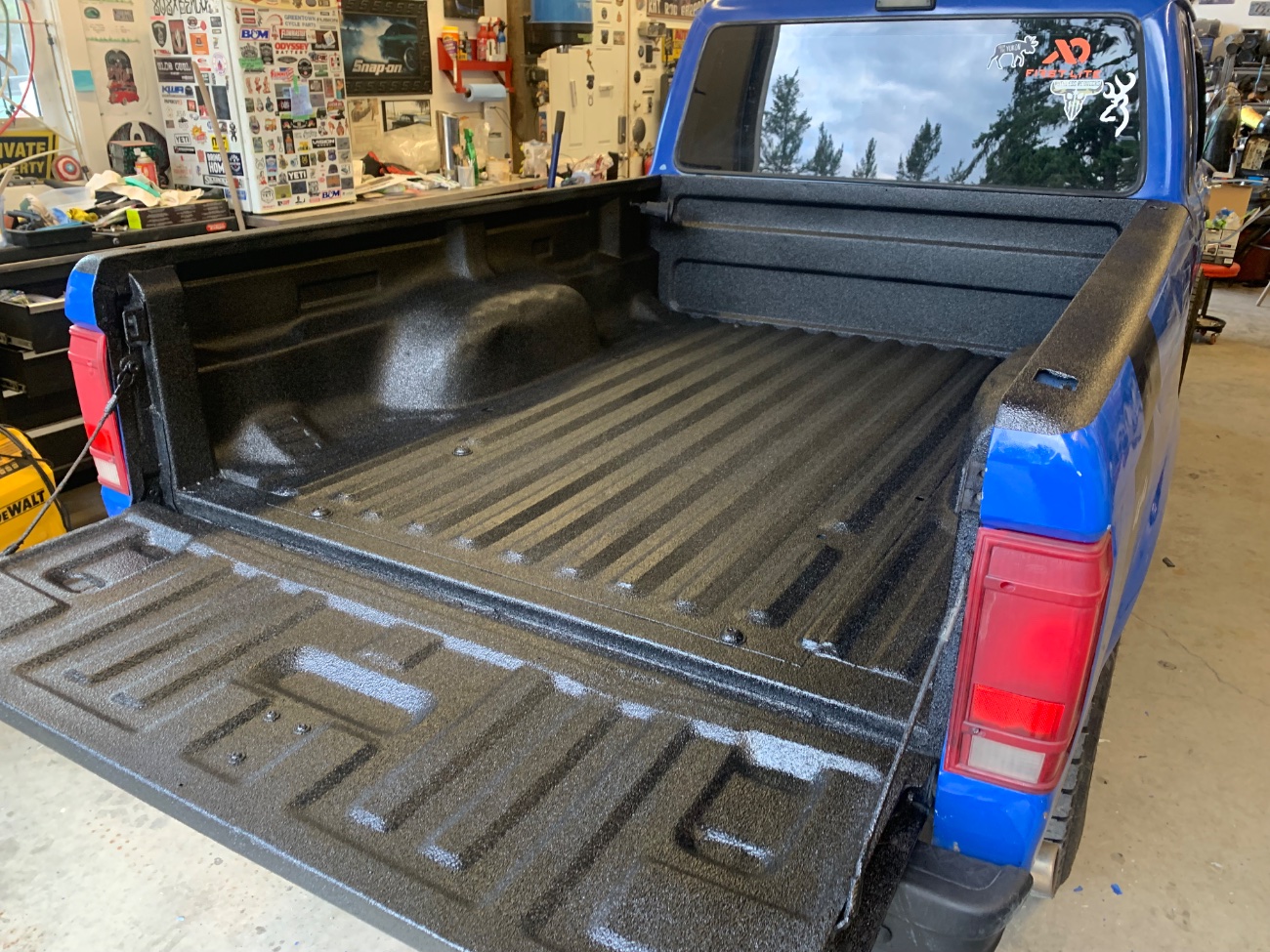 Well my niece came over with her blue 91 Ranger again and asked for help with spraying Bedliner. This time I sprayed Herculiner. Sprays nice, and only one coat is required. I’ll update with a post once it’s all cured and let you all know my opinion. So far I really like it and it definitely has some rubber content to it. Sprayed the headache rack too.