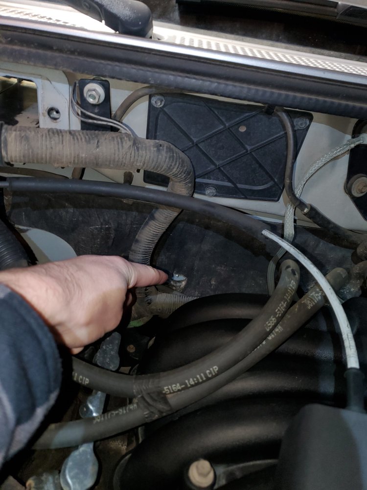 12) Now is also a good time to disconnect the coolant hoses that that go to the heater core through the firewall... they are right under the PCM. Squeeze the hose clamps with some pliers and move them down the hose. I find channel-locks work well for this. You may have to patiently twist the hoses back and forth to break them free if they have never been replaced. I didn't bother draining the coolant since this is near the top of the system, but a little bit will pour out when you take the hoses off. Try to catch it since it's very toxic to pets, etc.
