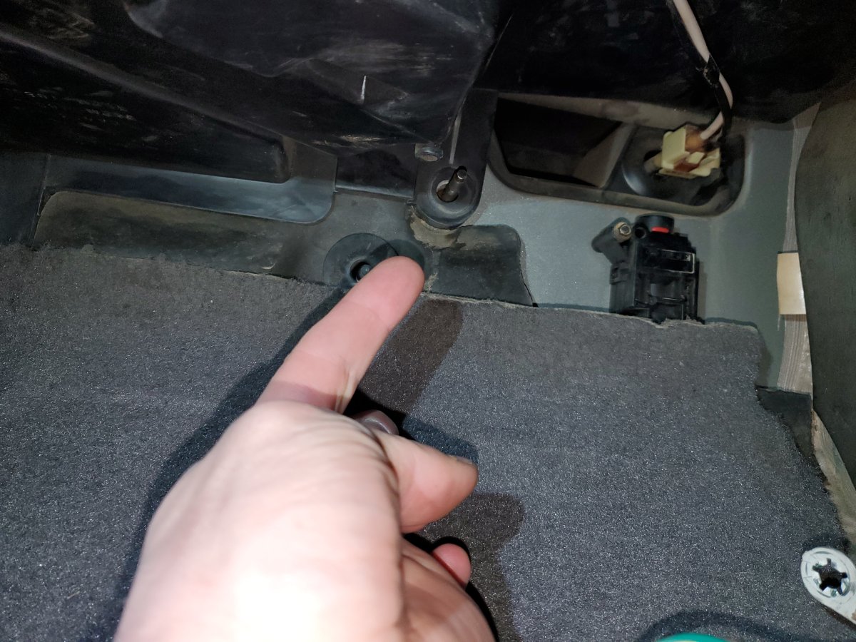2) Remove both kick panels (the plastic covers on the outboard sides of each footwell). You remove these by unscrewing the forward couple phillips screws on the floor trim strips to lift them up... the kick panels just tuck underneath those. The driver side one also has a plastic push fastener near the parking brake pedal.