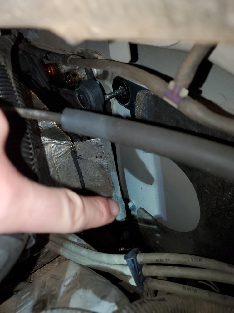 Remove one 11mm nut from a hole in the insulation on the firewall right behind the engine: