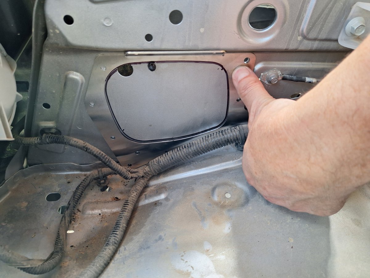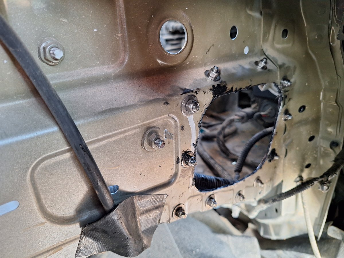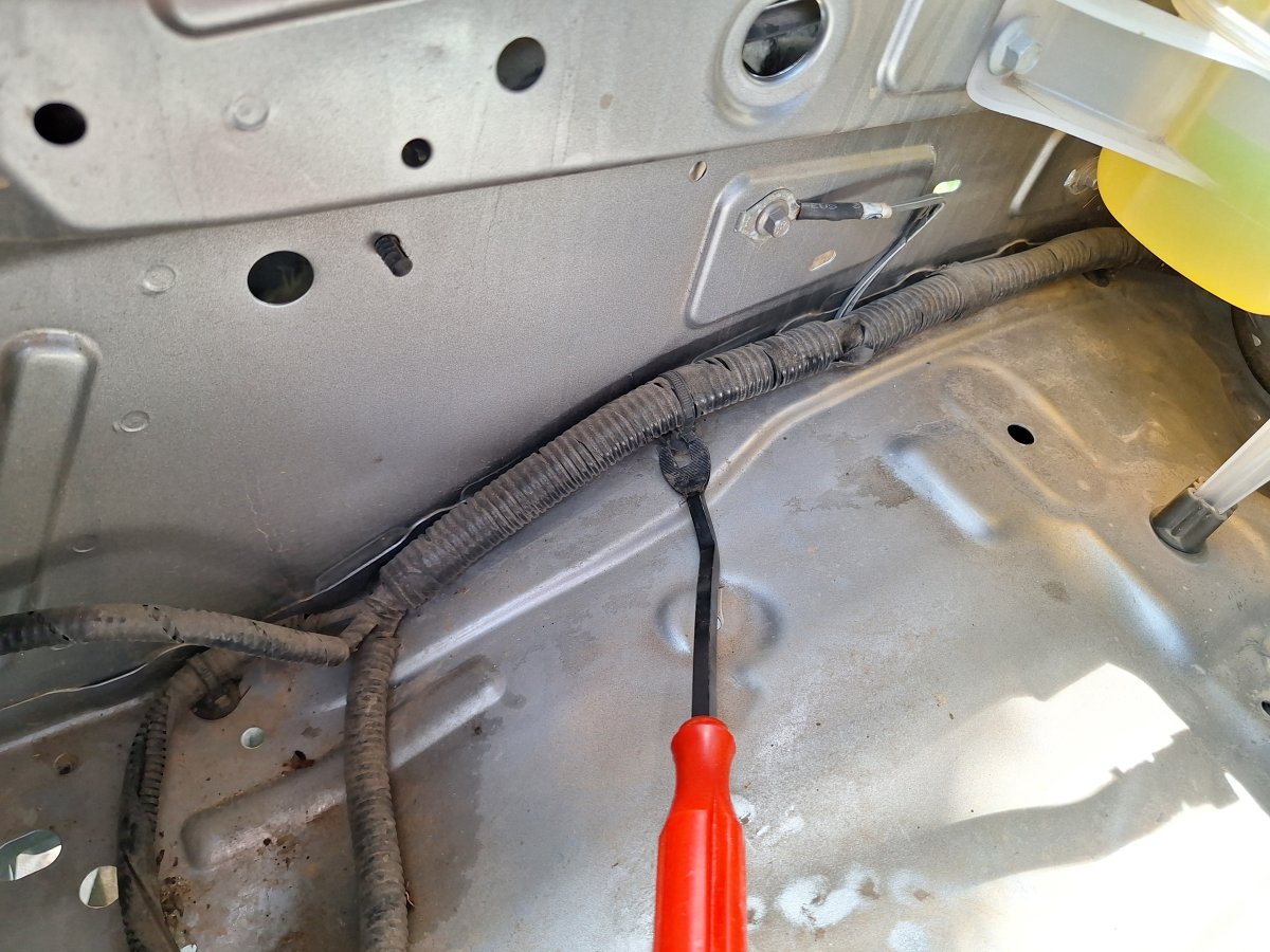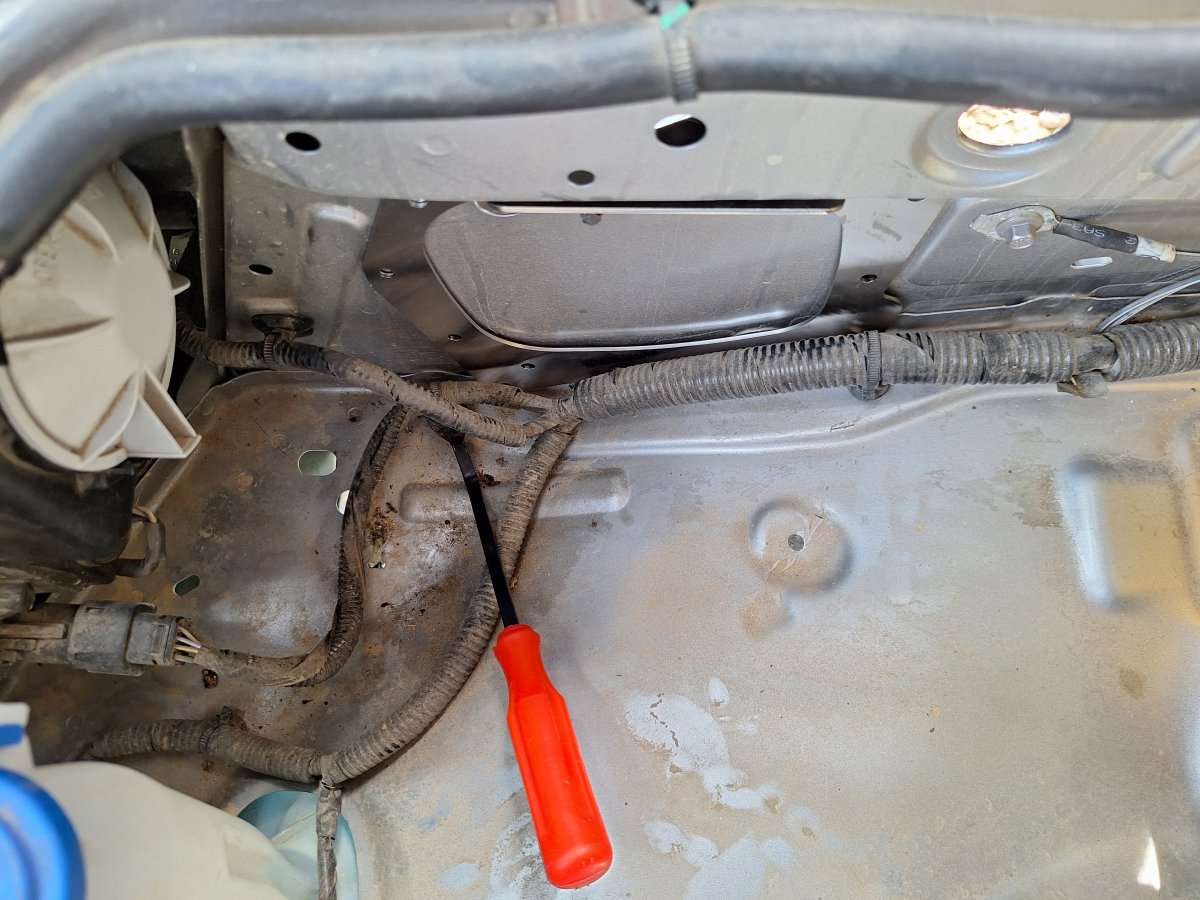 Remove the plastic hood latch cover from around the hood latch. The cover is held in place with a plastic mounting clip and an 8mm bolt.