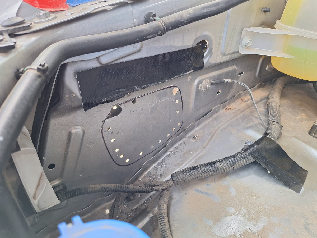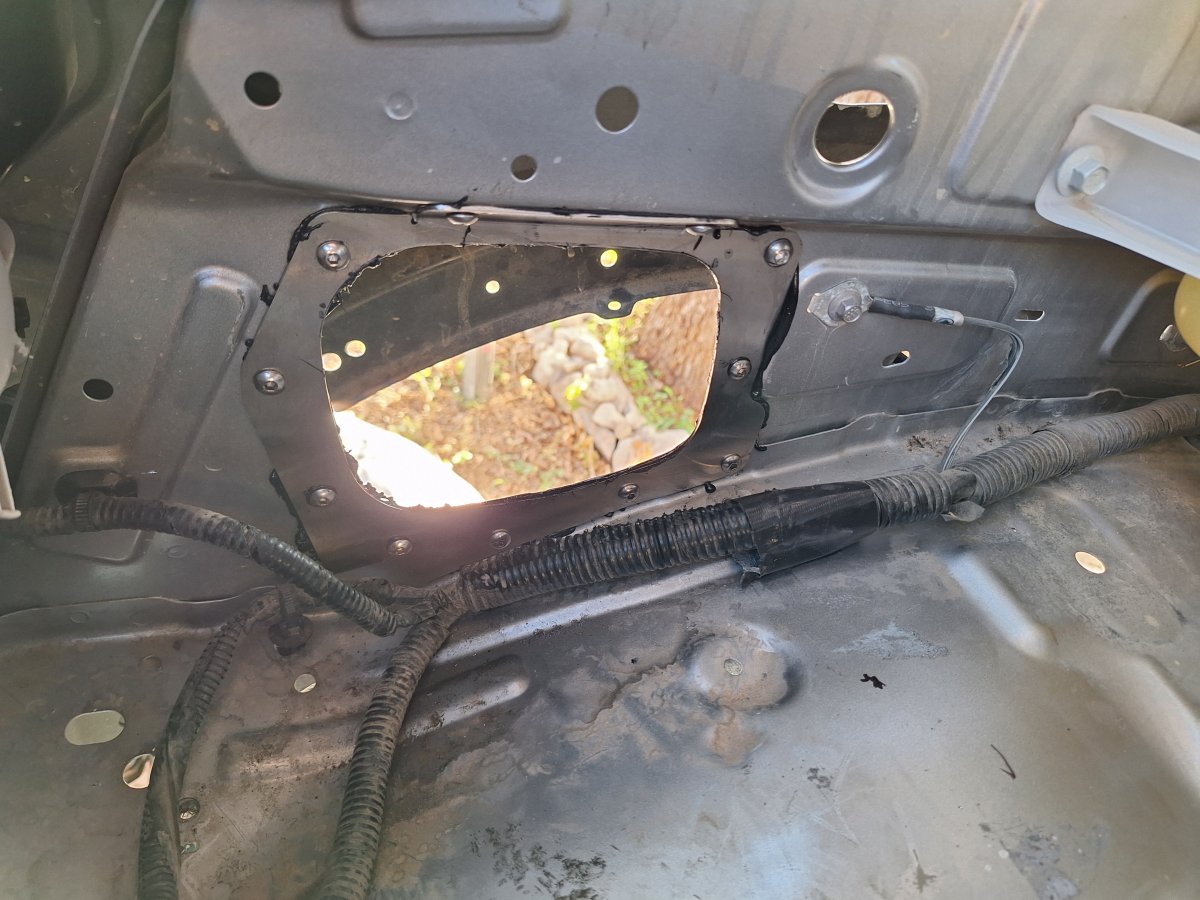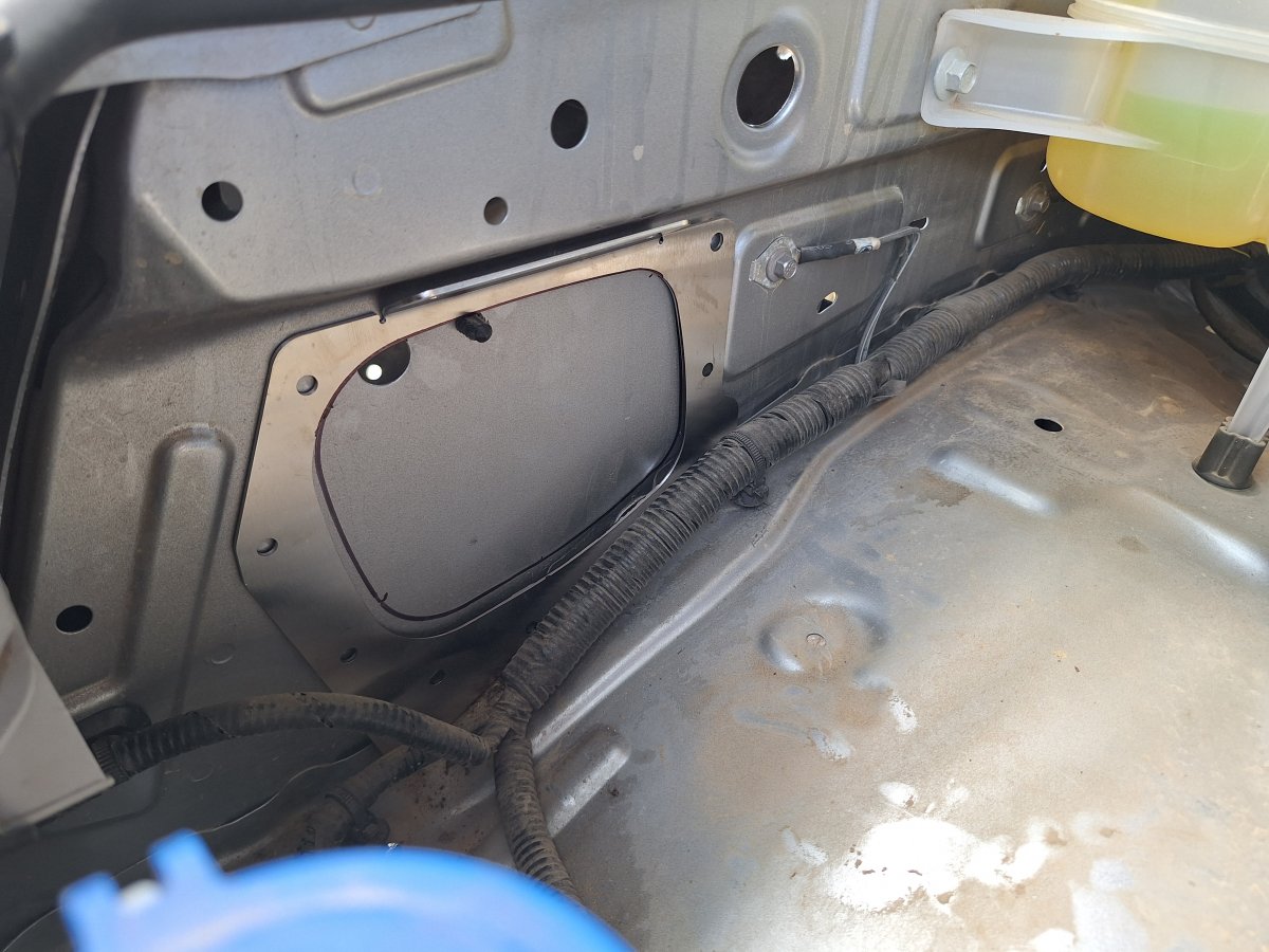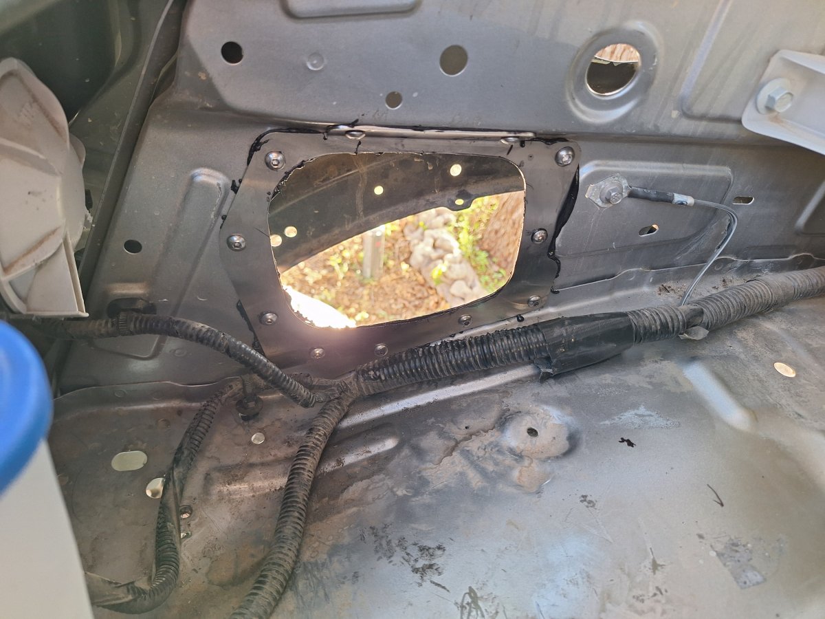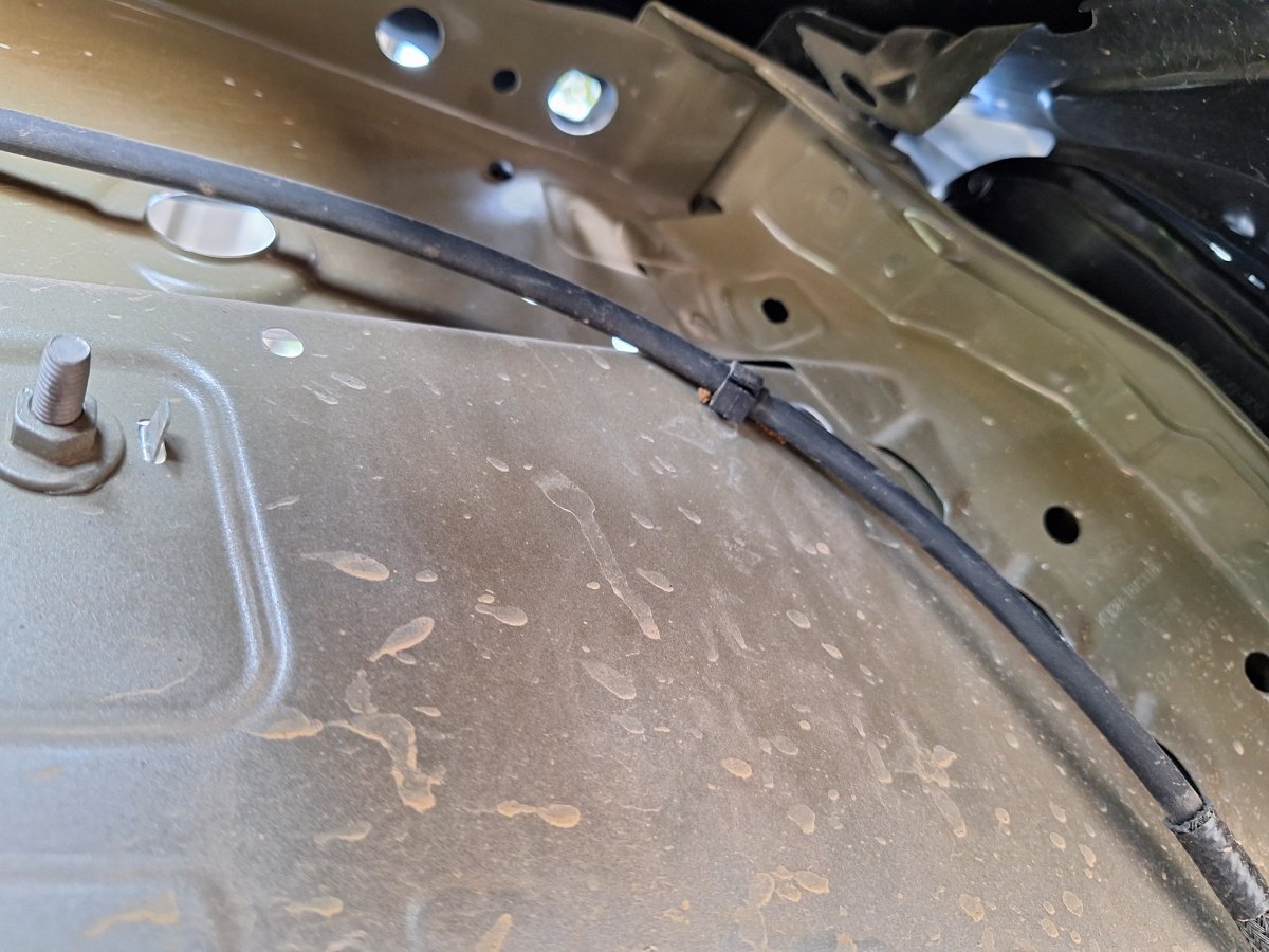 Remove the plastic hood latch cover from around the hood latch. The cover is held in place with a plastic mounting clip and an 8mm bolt.