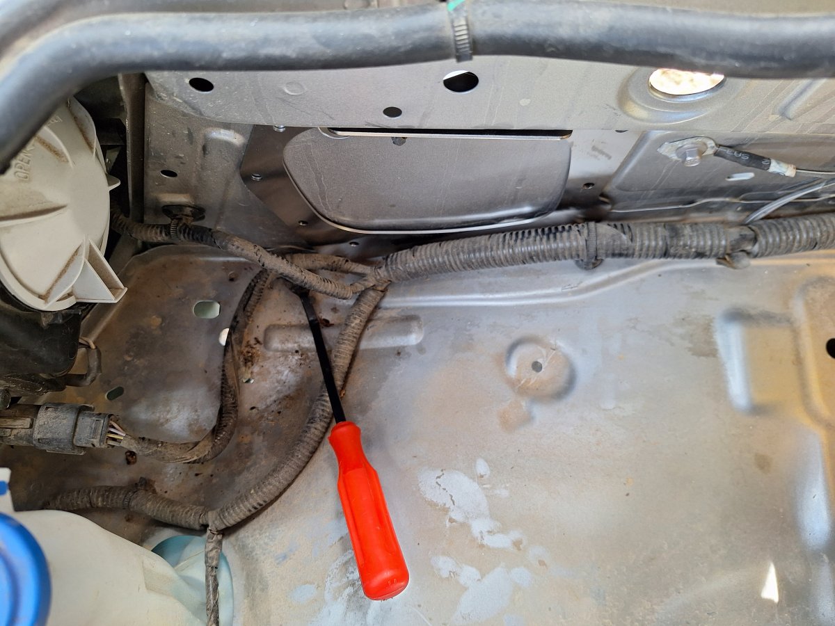 I used a small flathead screwdriver to release the locking tab on the right (drivers’ side) of the grill, and then started working it loose from the right to the left by pulling on the bottom of the grill. As I worked from the right to the left, I released the locking tab on the left side (passenger) of the grill and then completely removed the grill.