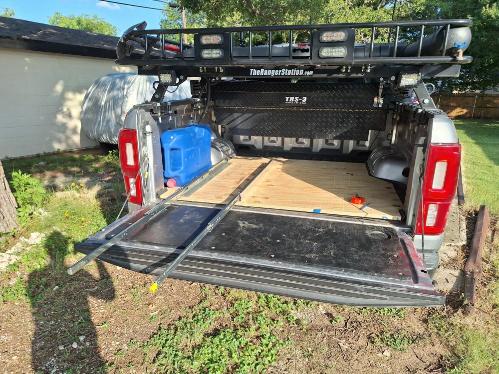 Loan Ranger I used a sheet of 3/4" plywood as a foundation to mount things to. I don't plan to run around with the fridge in the bed of the truck all of the time and still use the truck to haul things, so I like the idea of being able to take it out when I don't need it,