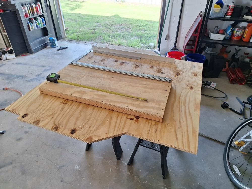 Now that I have a fridge I need a way to carry it in the bed and a slider to slide it out from under my rack so I can get to the goodies inside. I started mocking up a sheet of 3/4" plywood along with some 2-inch angle and a pair of