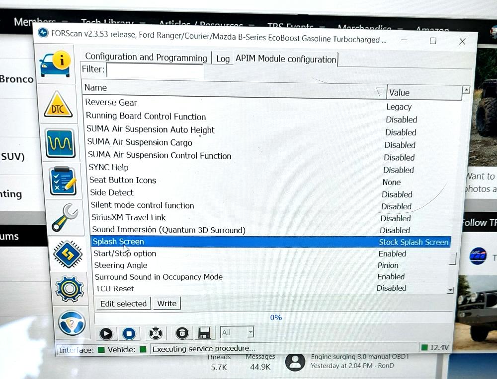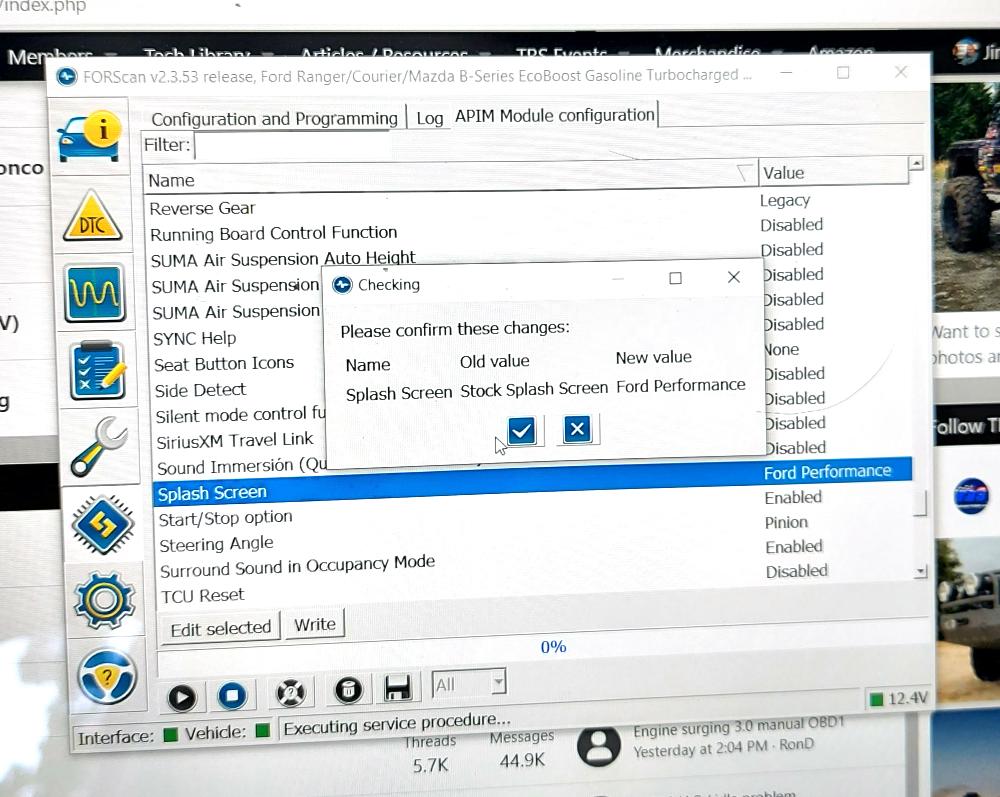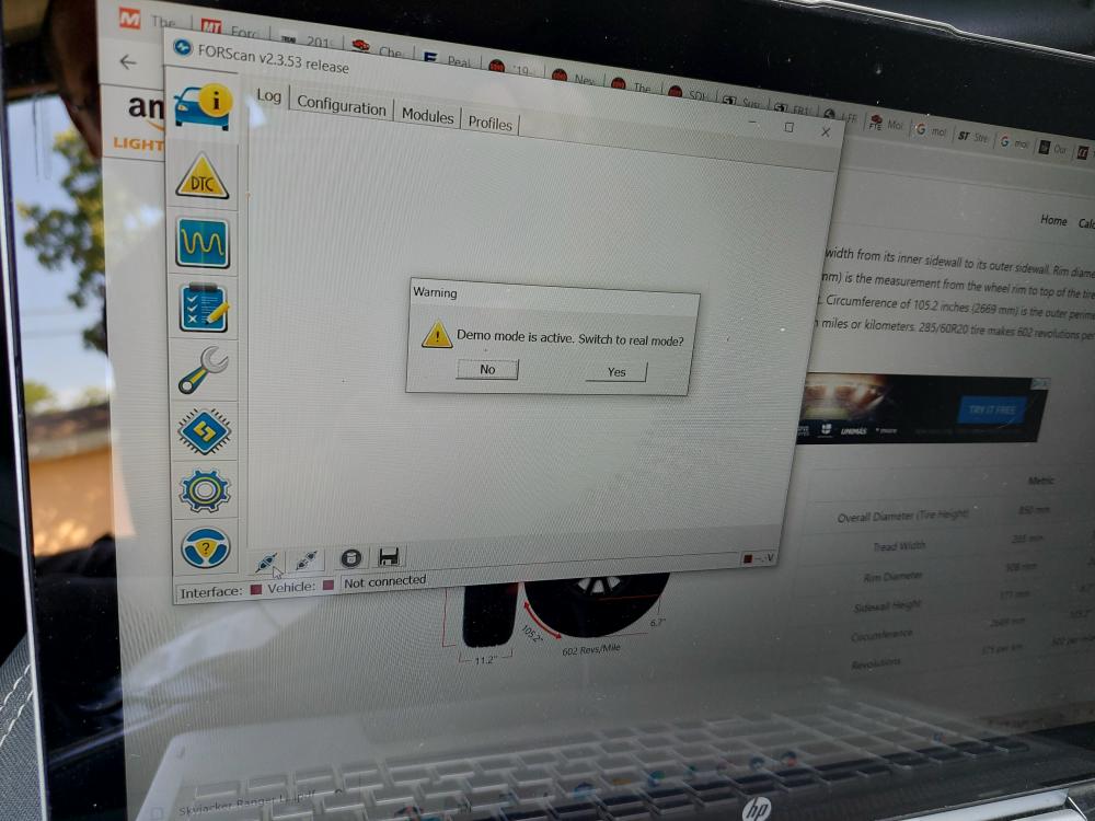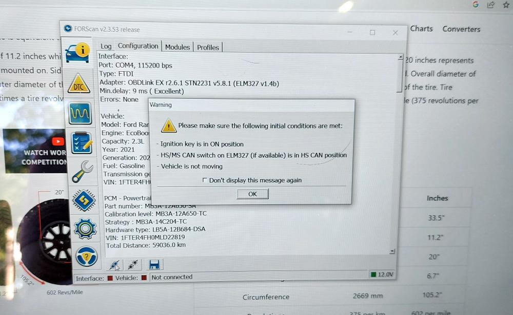 While connecting to the truck I got this warning message telling me that my adapter was not optimized for maximum performance and asked me if I wanted to improve the baud rate. I chose No since there was a warning that it may not work on some adapters. I may check Yes in the future.