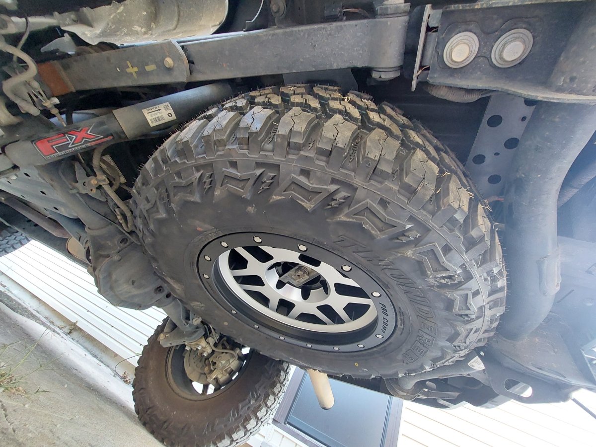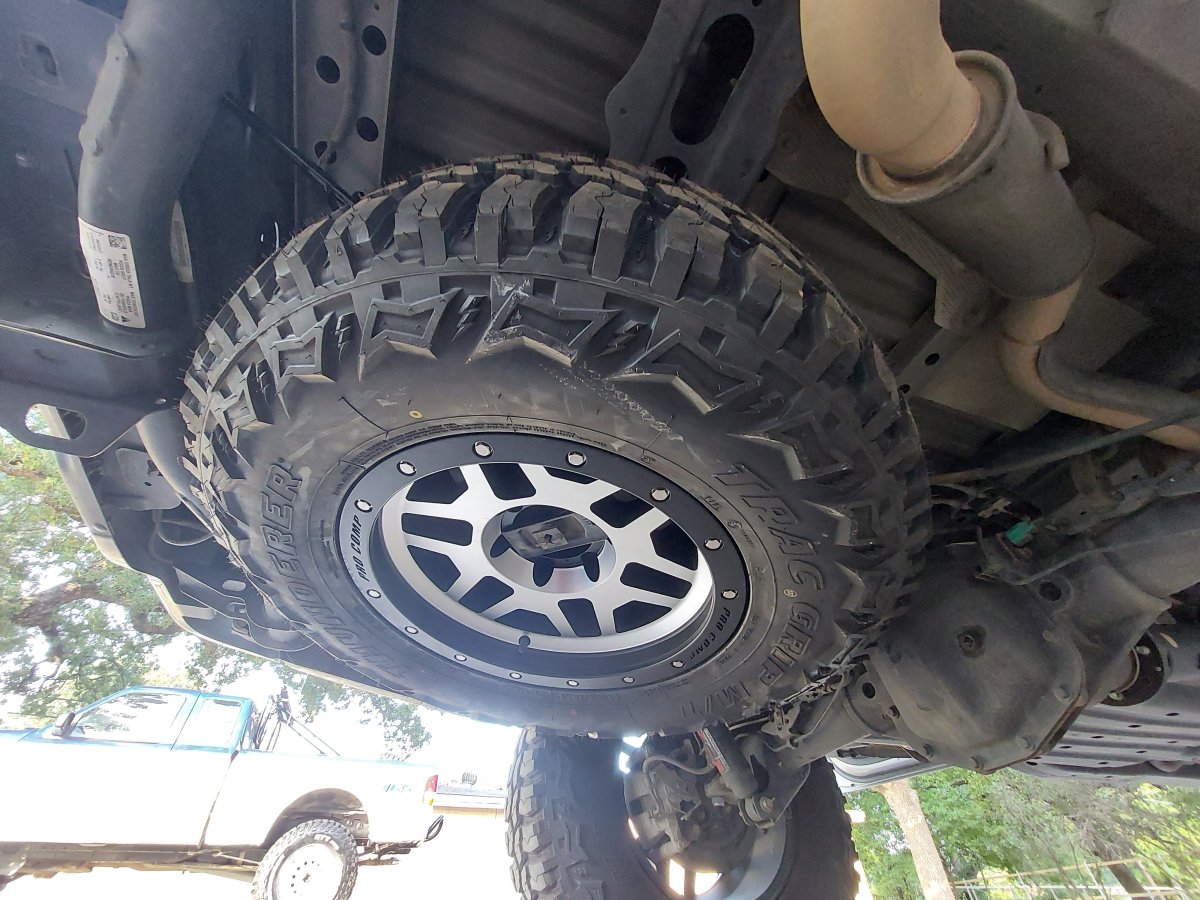 When I got the new wheels and tires I didn't mount the spare under the truck because I wasn't sure if it would fit, and a company had offered me a new bumper to promote that had a swing out tire carrier. After realizing they weren't going to come through for me I decided to mount the spare under the truck.