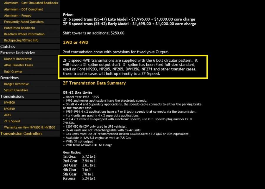 Hi, I have a ZF S5-42 behind my 302 in my 1988 ranger and I bought some 4x4 axles....a 9" and a DANA 44, my question is while searching for a transfer case and tail housing/shaft for said transfer case, is there any difference in splines and mounting or are they all same "