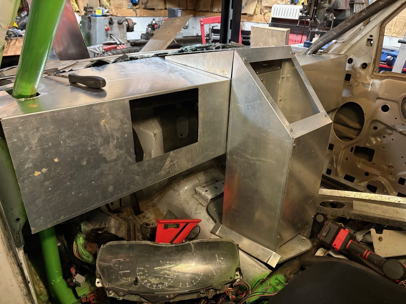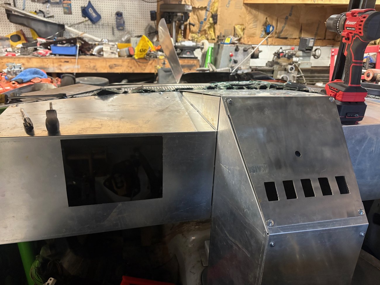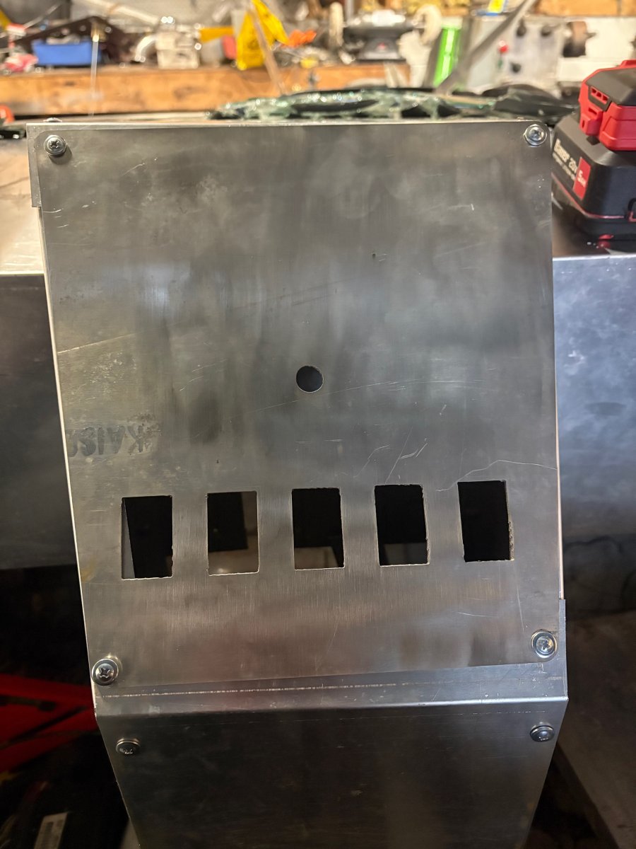 Switch plate cut and installed. Nothing special but was able to get the proper size holes cut for the Carling style rocker switches. The center 1/2” round hole is a purposely undersized hole for the push button start switch. I’m not sure on what style I’m going with so I wanted it small enough it can be drilled out to size with a step bit. Why have the hole at you may ask? So I know it’s already centered properly
