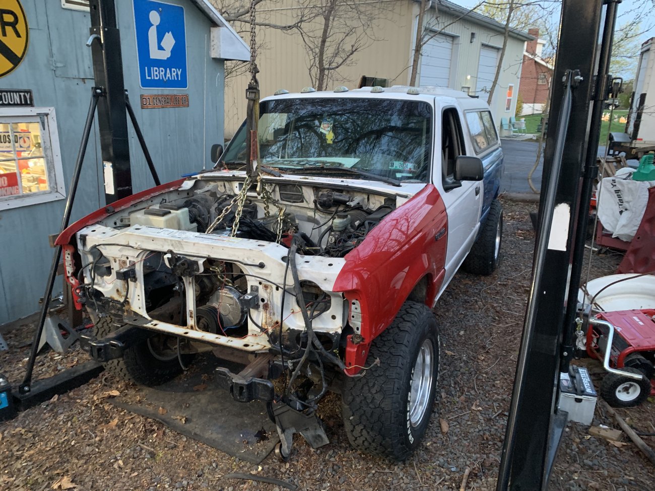 My name is Ethan and I bought this 1998 ford ranger 2wd with 70,000 miles on it, found a red front end, and a blue bed of my old ranger. Lifted it 2 inches. Drove it awhile and melted the wrist pin out of a cylinder and decided I throw my favorite motor in it.