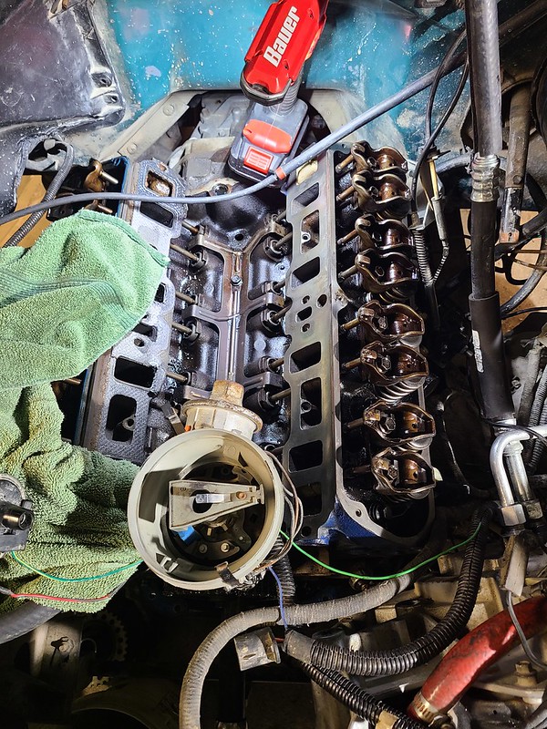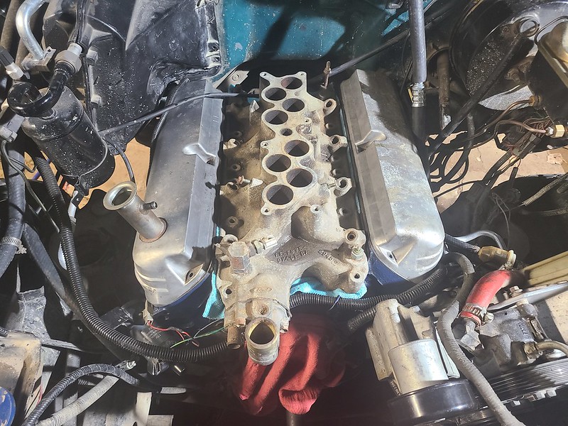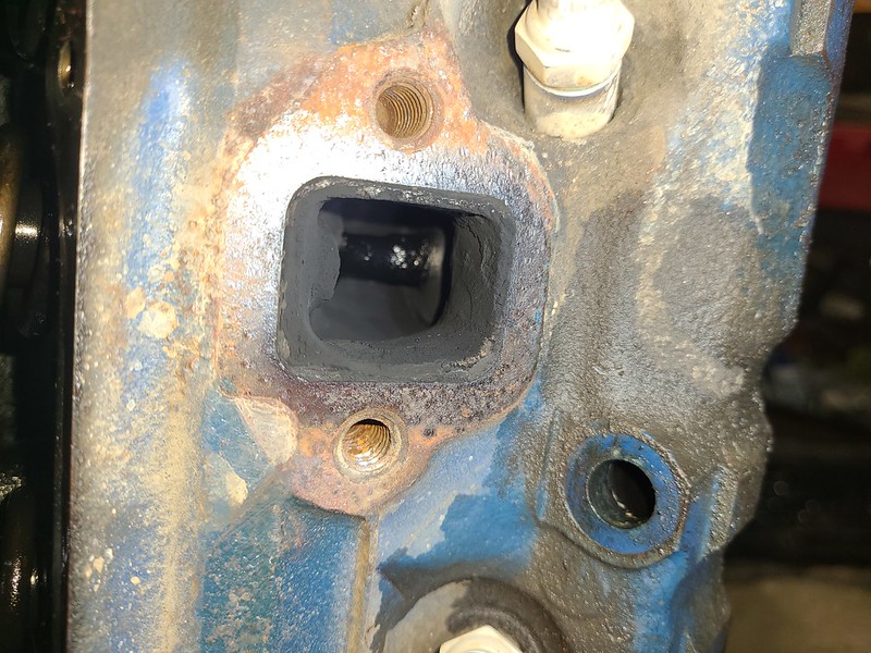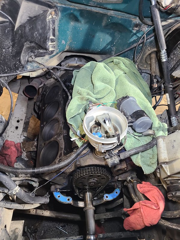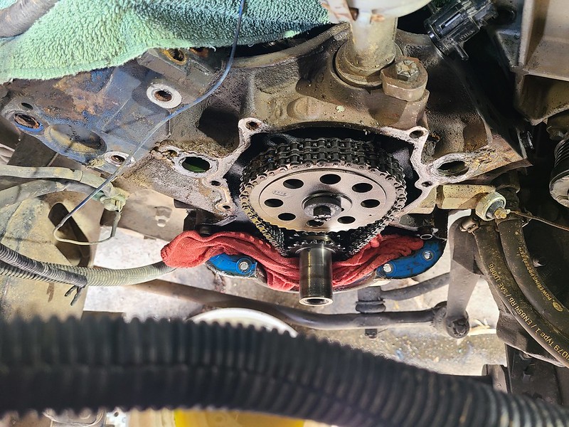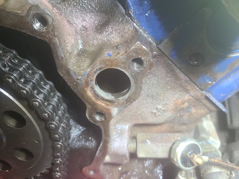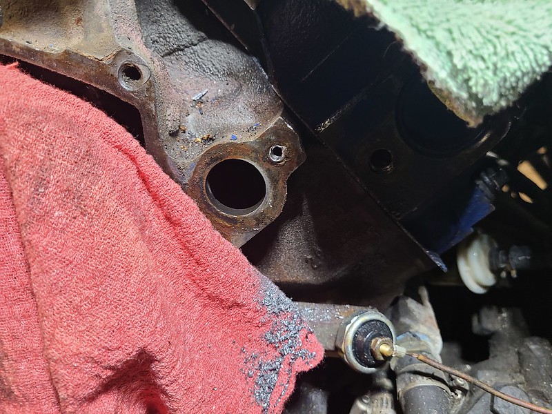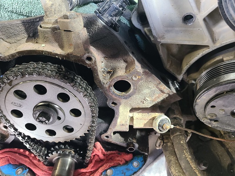 Of course one bolt fought. I tried working it back and forth, I tried putting penetraiting oil in every seam I could to help it... it didn't make it. Looks like it broke off flush with the block. So now I gotta pull the timing cover which is spectacular. Hopefully I don't screw up the oil pan gasket too much so I don't have to redo that too.