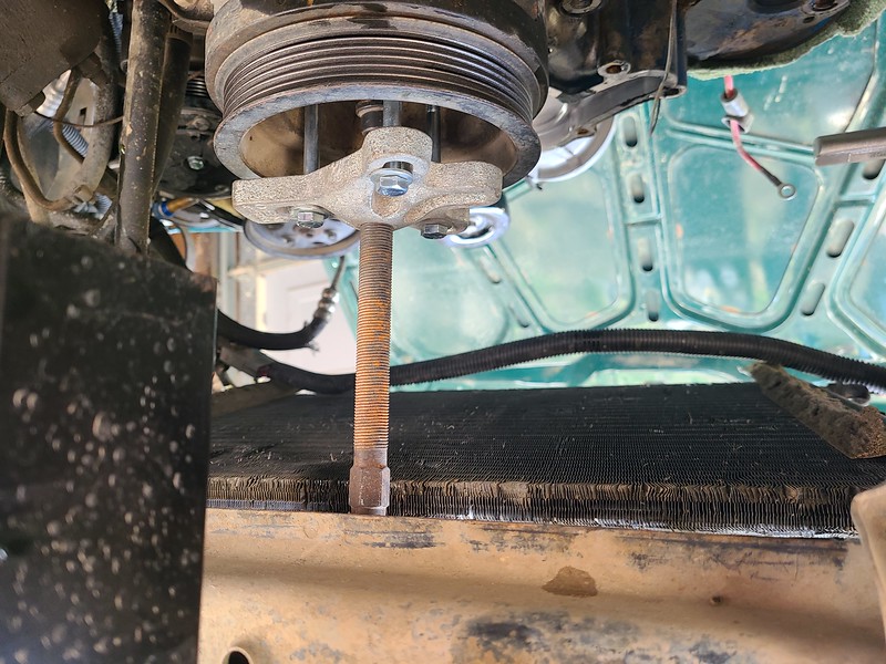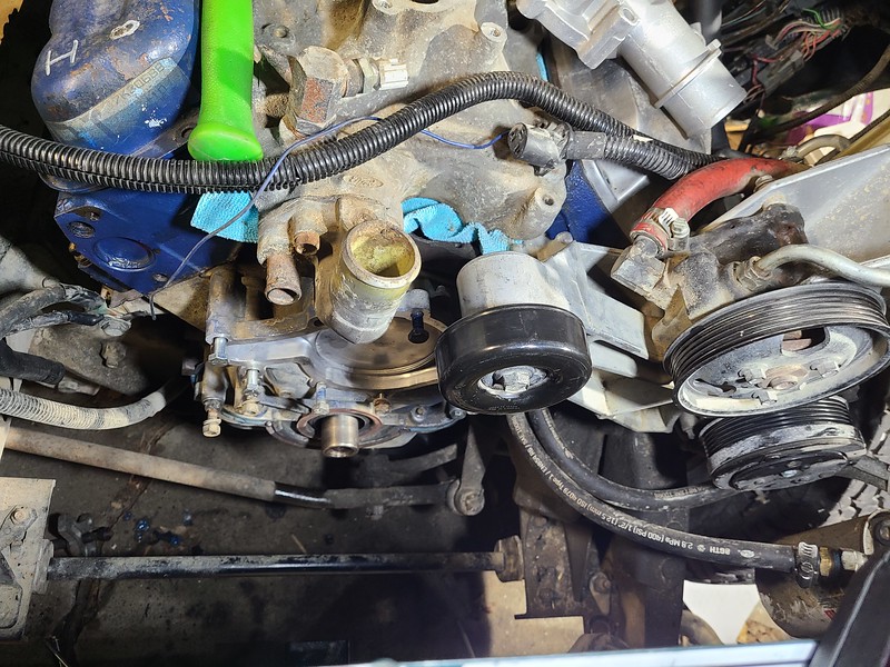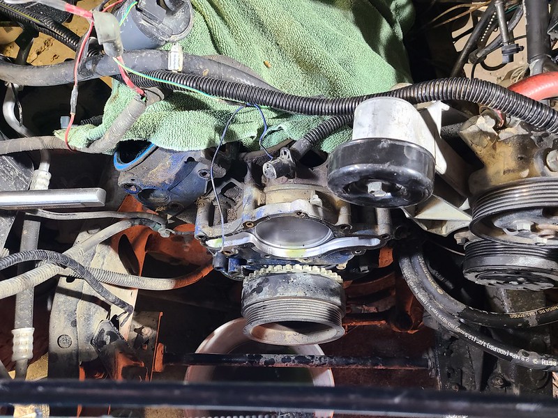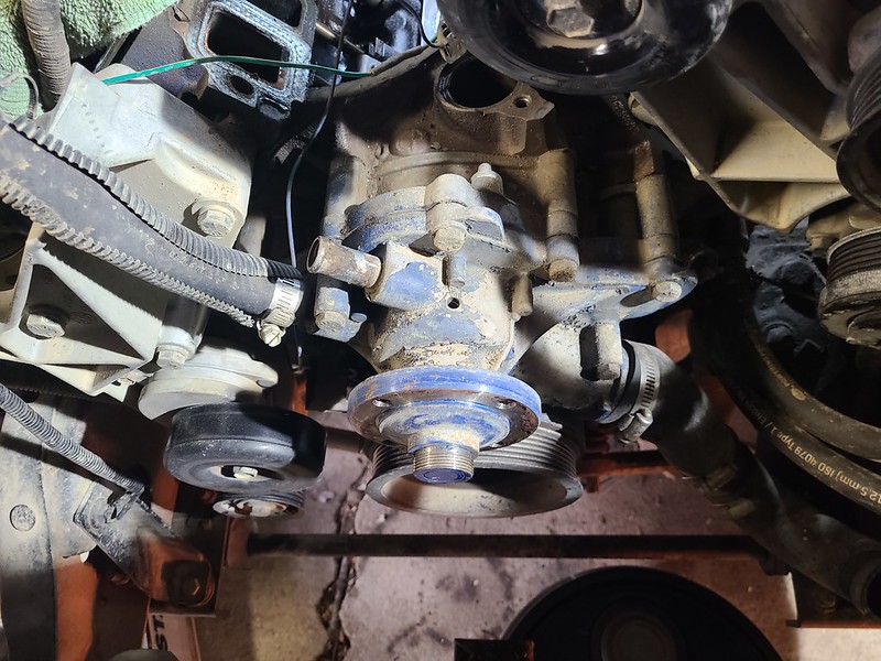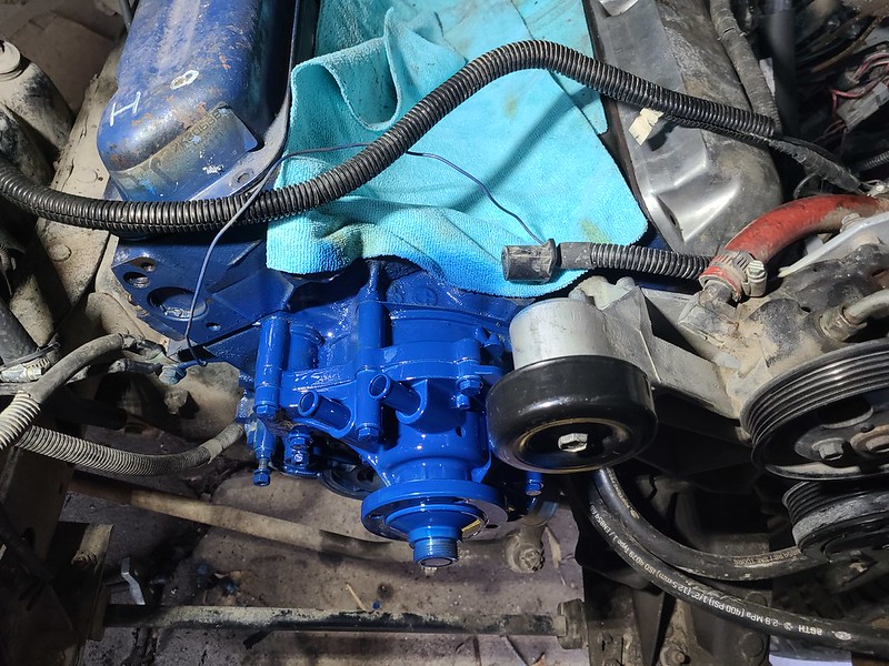 So I decided since without the head on the block the front bracketry can move out of the way more I might as well go ahead and slip the water pump off and prep the timing cover so when I am done with the heads I can just slip it on and be done with it.