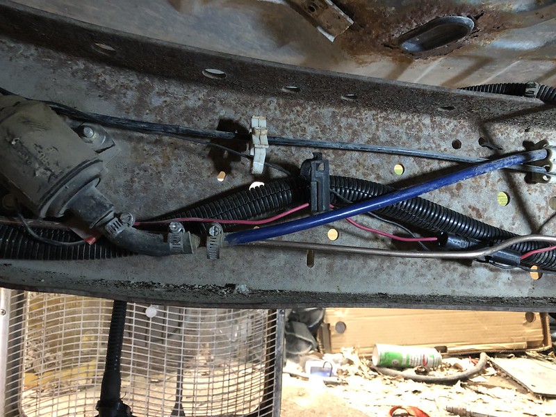 BU light harness is finished, it is now plugged in and safely hanging down outside the frame rail awaiting the installation of the trans.