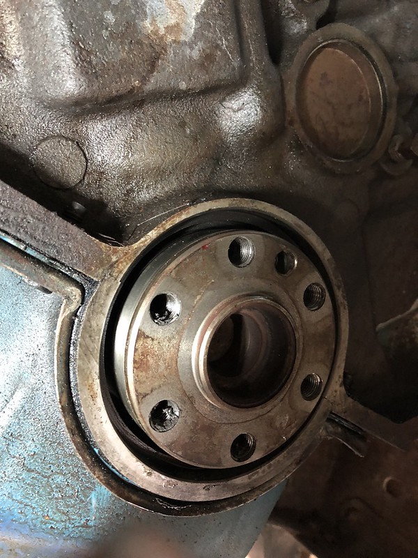 So I drill a hole in my new seal, pull it and sure enough the sleeve is a quarter inch deeper into the engine. I manage to work up a bit with a pick, get needlenose on it to assault it some more, the needlenose vicegrips to jerk it off. I was kinda scared there for a bit actually what kind of mess I got into. Didn't get any pics of the process but I have spent $25 on more fun activities.