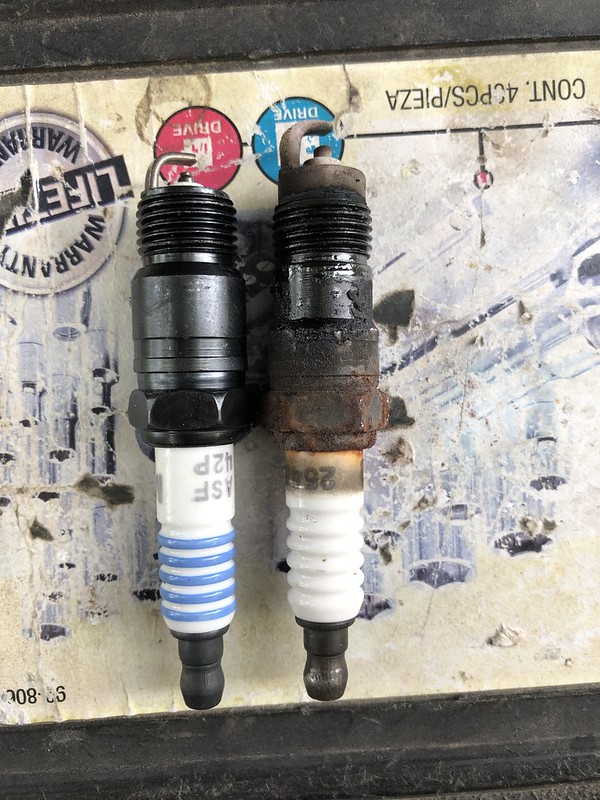 I have noticed some slobbering below the headers, I didn't now if it was valve cover seepage and the headers just kept it cooked off or what. So I change the plugs and the new ones that both the manager of O'Reillys and Rockauto say should fit my heads look totally different than those that were in the truck. Looks like the seepage was because there was no way for the plugs to properly seal. And then they protrude a lot more too. Looks like they were running nicely otherwise though, all 8 had a nice toasted marshmallow look to them. They haven't been out of the truck since the head swap in 2012.