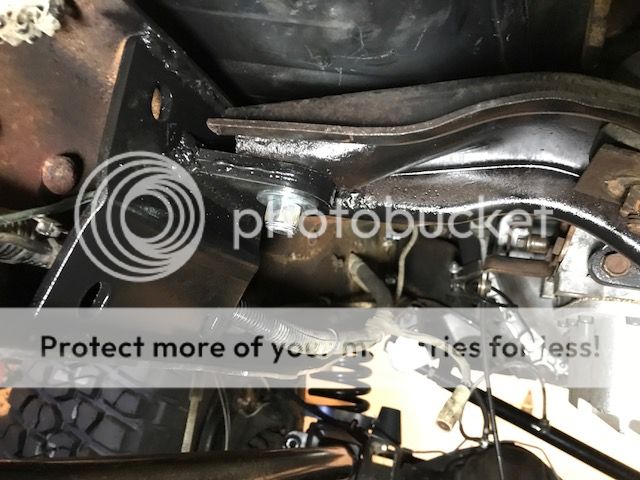 I cleaned up a stock Early Bronco trans crossmember and making mounts to the chassis was way easier than I thought it was going to be. I ended up setting the drive line angle pointing tail down -5*. I really couldn't get the tail up any higher,I was shooting for -3, since the tail housing was already getting close to touching the floor pan. I took some leftover brackets from my Duff kit that weren't used to make a small boxed section of the frame and welded some generic shock tabs to doubled up and welded together.