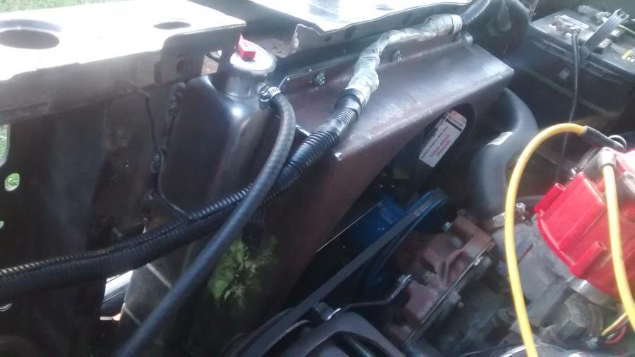 Ok so after more cutting and welding the shroud was ready to drop in only it wasn't that easy was a huge ptia to get the radiator and the shroud in together but I did I only wish I had painted it I wanted to see if it fit before I painted it but turned out to b alot of trouble just to get it in there so that will b another day so got it in and everything fired it up and it ended up still overheating:mad::damnit1: