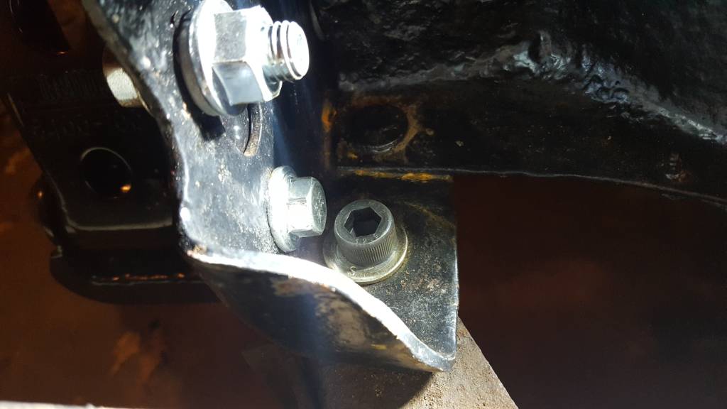 First, because I moved them back one set of holes (ie front bolts in the holes for the rear) I was no long able to properly bolt up my bumper or receiver hitch. While this isn't a huge issue because I am going to be building my own, I had to come up with a temporary solution. So, I chopped the bumper mounts where they interfered with the gusset on the hangers, and used a single bolt on each side. The first photo shows how tight it is there with the hanger bolts and bumper bolts sharing that space; however I was able to swap out the hex drive bolt shown for a standard grade 8.