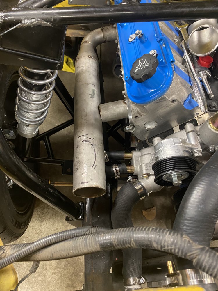 I built my turbo manifold to come straight out off the head and you can see it’s just above the heater hose connections.