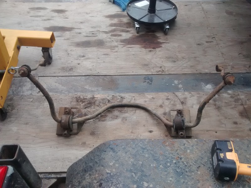 I drug my truck out of the snow and have it on my trailer so I can work on it. I'm going to be swapping motors soon, the one in the truck is really leaking oil and I have another runner from a 91 exploder to put in it's place. Until the weather breaks I decided to try to use a swaybar from a 97 f150 that I scrapped. I thought it was the same diameter as the elusive 1" b-2 rear bar but it's 7/8". That's still better than the 5/8" that I've been running. Here's a few pics;