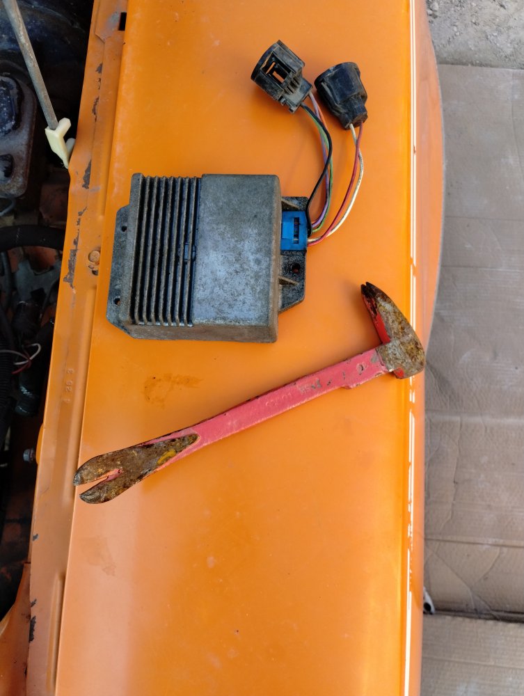 I was stuck trying to remove the ”duraspark box?”. There was 2 teck screws holding it onto the inner fender. Galvanic corrosion occured and when I tried to remove the screws the heads twisted off. I've been spraying it with catalyst type lube for the last 4 days. Finally after removing a plastic inner fender I was able to hammer at the screw points from the back side of the fender, and that shocked the corrosion enough to be able to unscrew one screw by screwing it the rest of the way thru the hole. The other screw popped out with a hammer and prybar, leaving a bigger hole in the fender. That's ok, I want to move the box up and inch or 2 to make easier access to the connectors.
