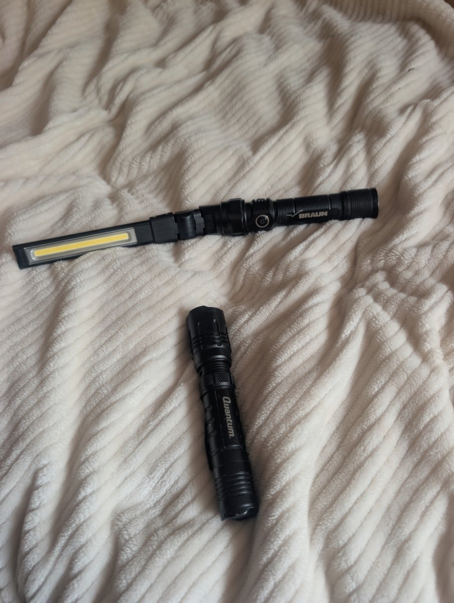 ..and I'm not terribly impressed with either lol. The quantum flashlight is kinda neat because it somehow has a SQUARE beam pattern out of a round reflector, turbo mode, adjustable focus.. but the switch is WAY too touchy.. shake the light around and the beam will flicker. If it wasn't for the crummy switch I really wouldn't have any issue with it for the price.