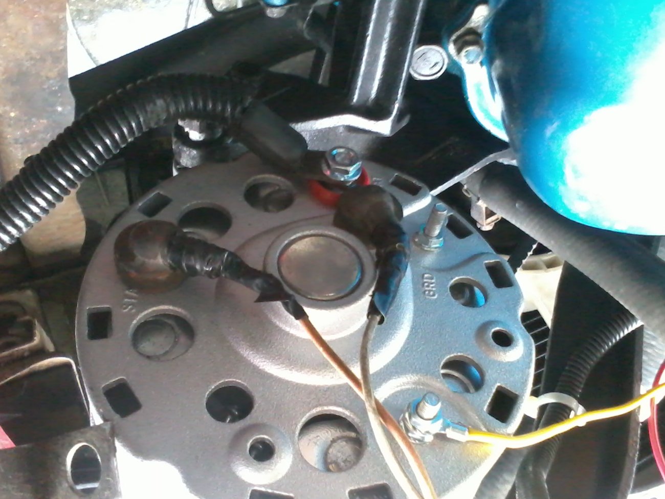 i have rewired the alt directly to the regulator with new wires. ground, and field and stator. the wire harness is a bit chopped from PO i also eliminated the (brain box, and electric crap).