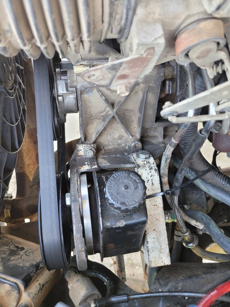 I already had a fan out of a Durango that I made fit. Also already had the saginaw pump in the barn. No idea what is from but its the 80s style fitting type. I used the PSC MB03K bracket, Pully from a 93 pontiac transport and pressure line from a 93 e250. The power steering in fantastic. So much better.