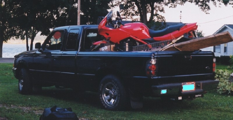 I hauled my buddy's old street bike in the bed of my Ranger along with a load of stuff for college, we just nosed it into one corner, put the back in the other corner, strapped it down front and back then piled everything else in around it, lol. Survived a 100+ mile trip that way.