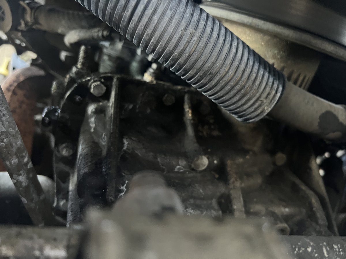I'm having difficulty determining where the photos are showing the leak in the picture. At the back of the engine by the transmission?