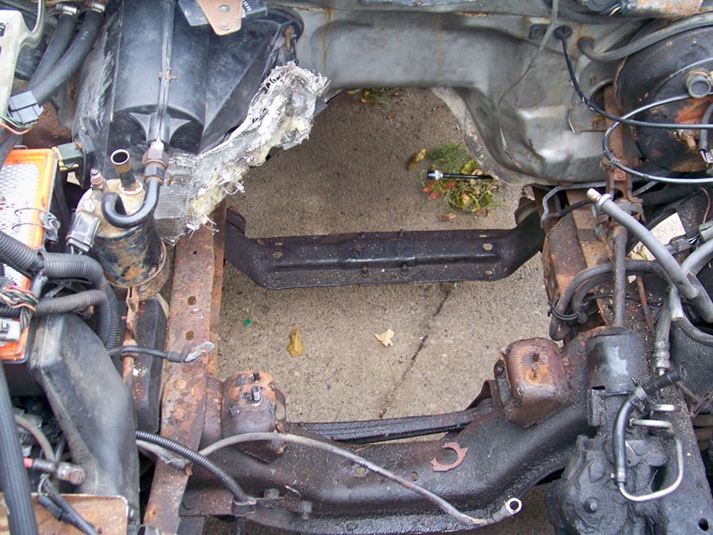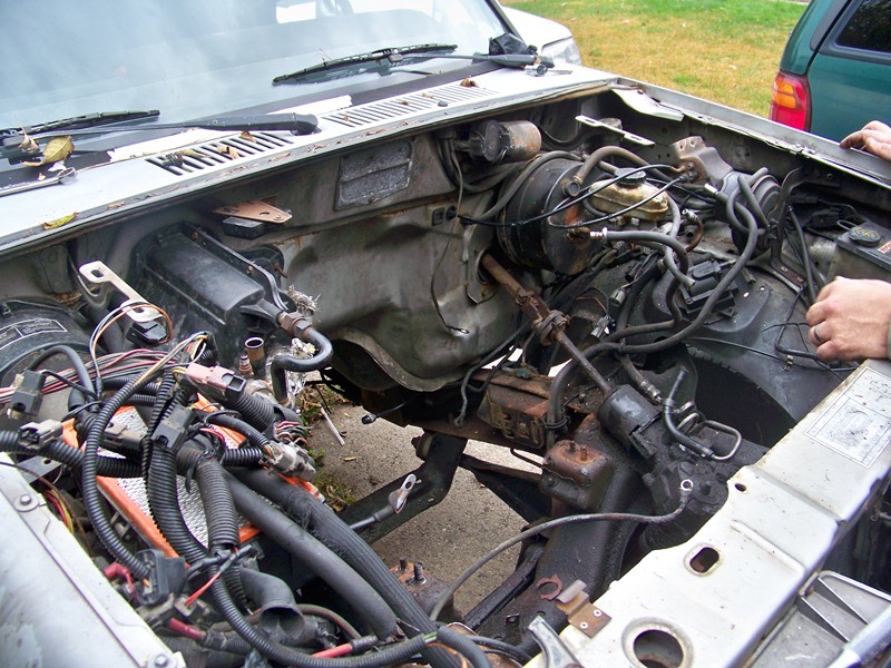 I was so happy to see that ugly pig out of that engine compartment!!! I then stripped the compartment of non-essential items for that engine. Air box, heater box and such. Since the engine was out, I took the time to also remove the harness, since it will never be used again.