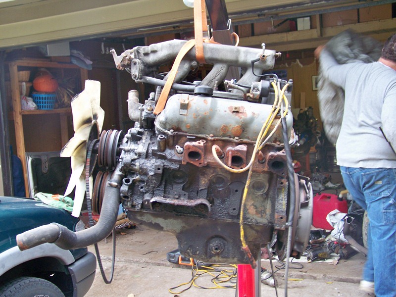 Well my son and I started in early today hoping for a good amount of progress but it wasn't to be. We disconnected everything and didn't take us long to pull it out. We had to stop a couple times and change how the hoist was rigged but no big deal. If that wasn't the nastiest engine compartment I don't know what is. Oy vey!!!