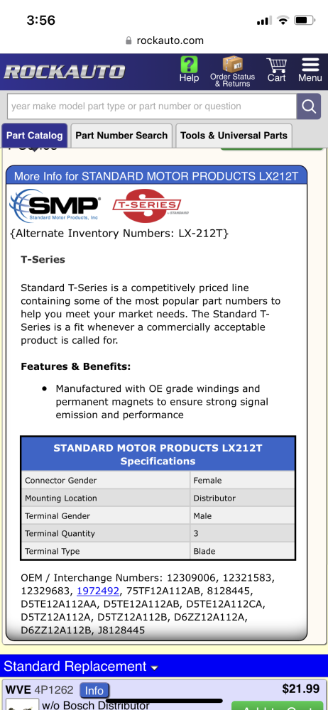 Well, it appears as if the pick-up, inside the distributor, is still available from Standard Motor Products. and it's about $40 shipped. That's not bad. Of course, I'm not sure if that's the problem. I do have a spare distributor that needs rebuilding but I'm not sure if anyone rebuilds them anymore. I thought I read in this thread that Cardone will still do it if you request it thru an auto parts chain.