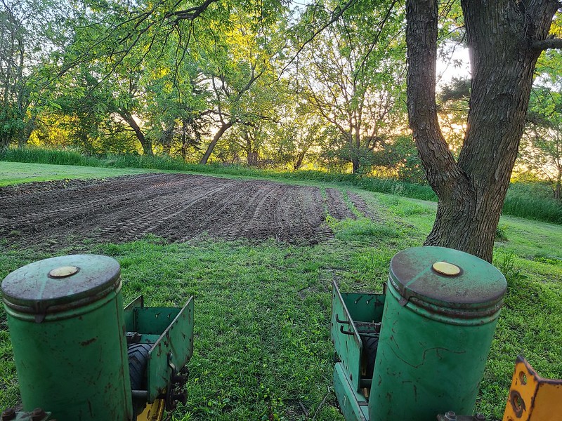 It is late but the sweet corn is in. Potatoes are up and looking nice, I have cultivated them once with the tractor already.