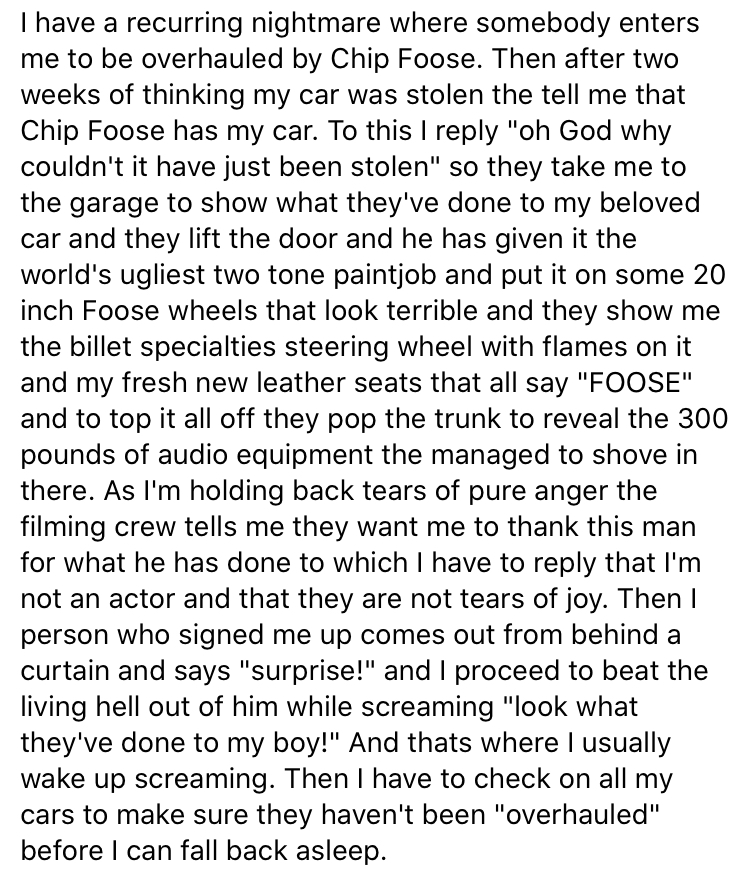 Well. You just made my day."Hey Chip, yeah this is @PetroleumJunkie412, my uncle @rusty ol ranger has been trying for years to restore his beloved 1987 Ranger and really needs help with the bodywork and powertrain." "Yeah, you can do whatever with the paint but keep in mind his favorite color is a purple they used on Toyota minivans." "Powertrain?" "Yeah he is huge into Subarus and is infatuated with the 4U-GSE out of like a Scion FRS, he is kinda old so you probably should go with an automatic too." "Yeah it would take a lot of frame modification to fit the flat four but it would really mean the world to him if you could make it happen." "Of course, he is very into audio you had better go all out on that too, he has been wanting to get one with voice control if you can find one of those”