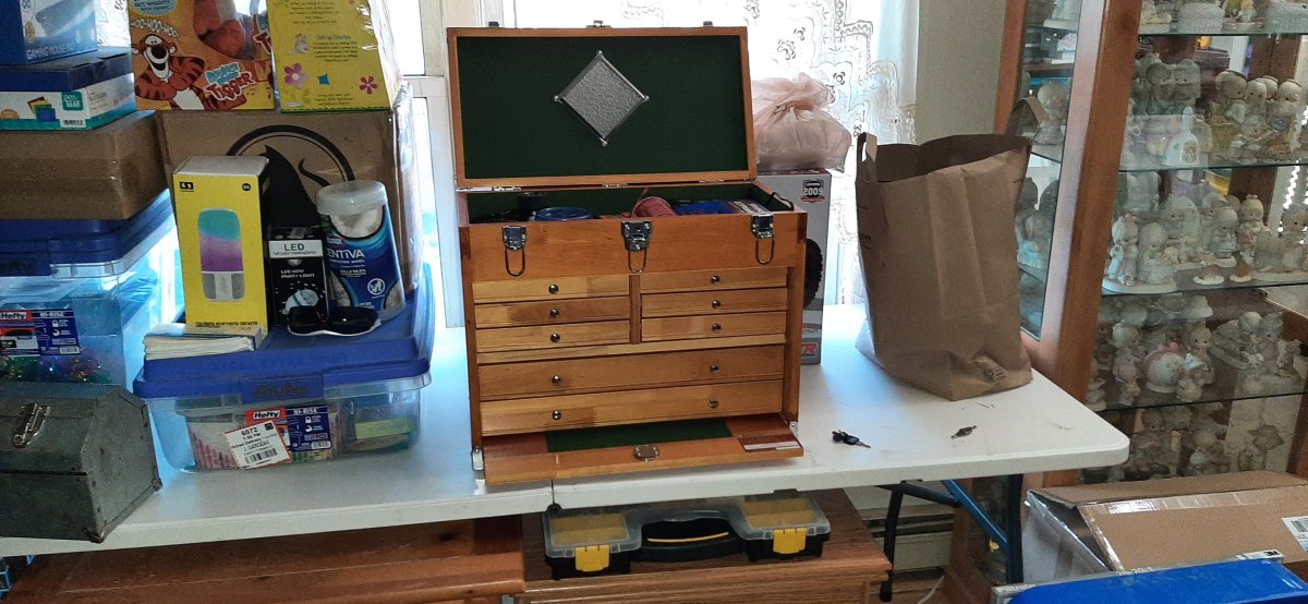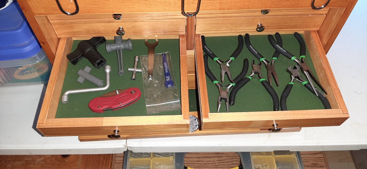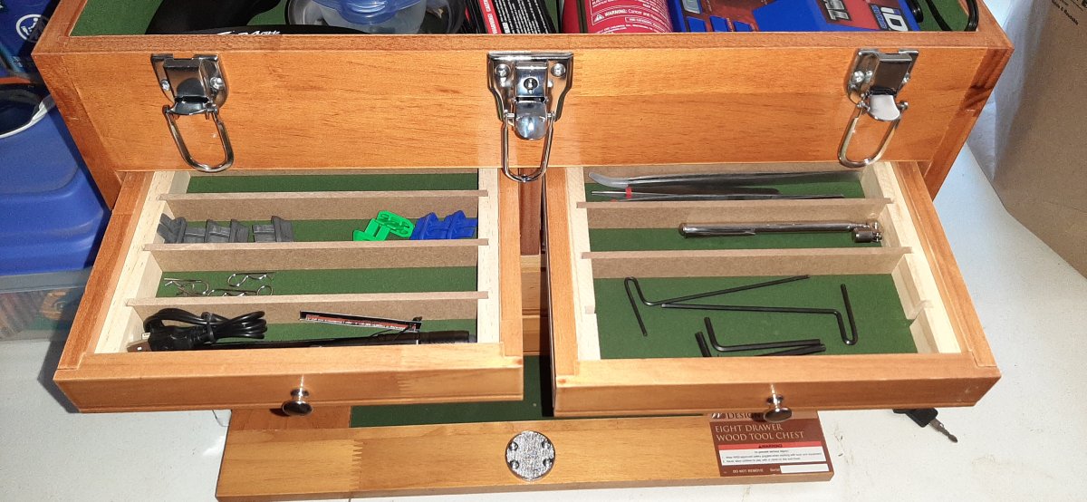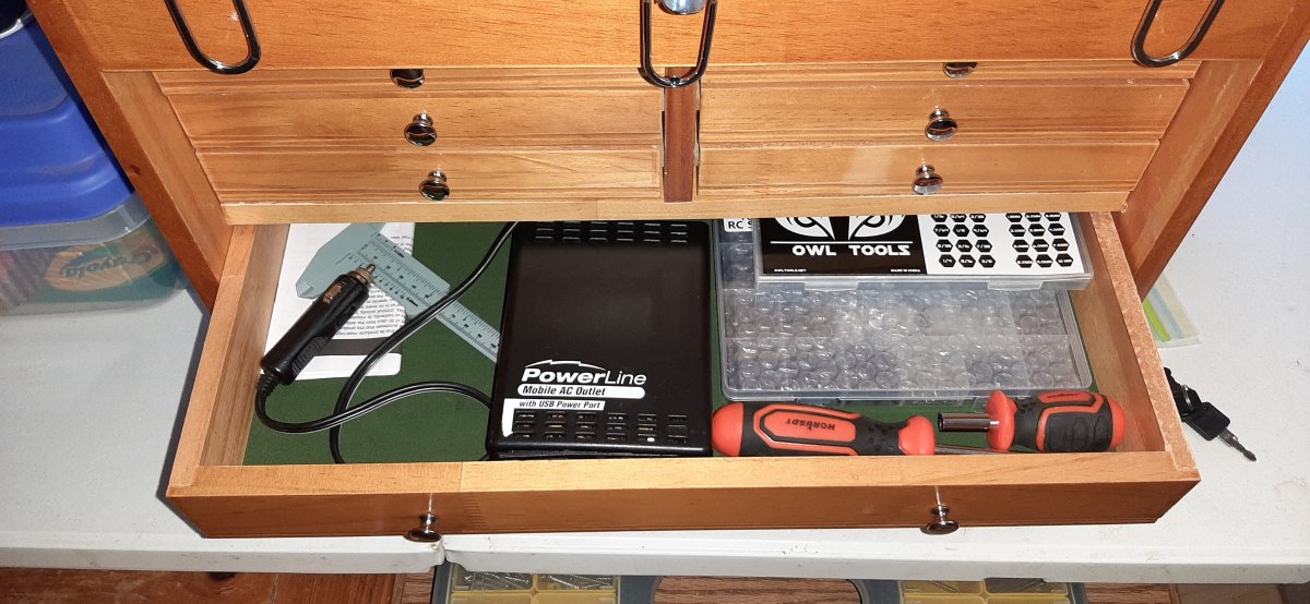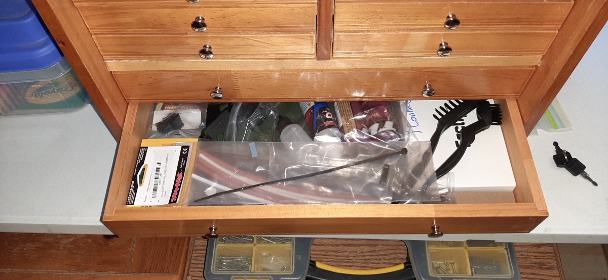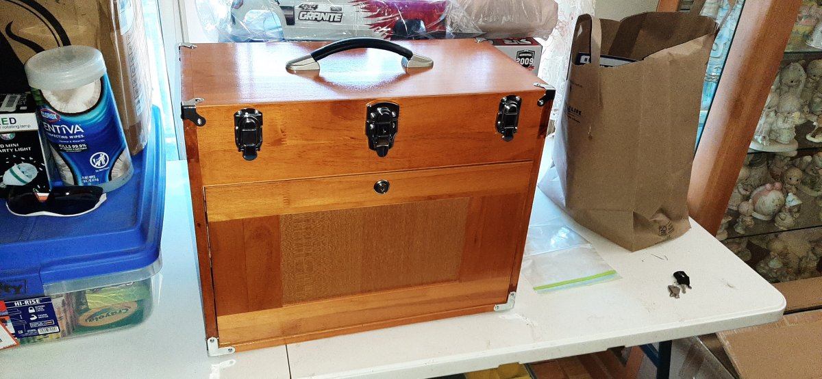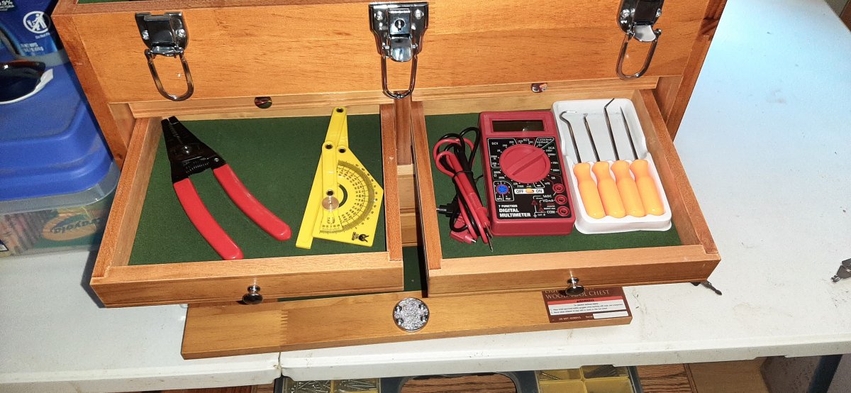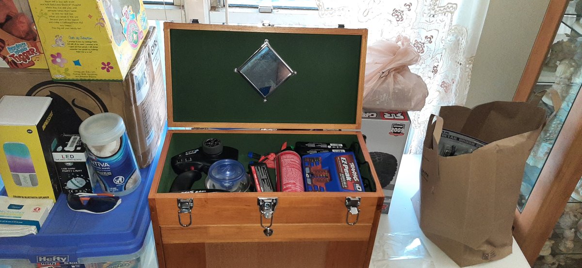 Then came the need for a GO box. In my early 20's I had a Plano tackle box that had a deep top compartment, 3 drawers and the bottom one was deep enough to allow me to keep the charger in it with battery's and soldering iron and a few other things in it and I looked high and low for another one and found one of FB market place but in New Jersey. I contacted the guy and offered to pay double asking cost and all expenses for shipping and he blew me off So I spent days running around looking at tackle boxes and tool boxes. Finally one day I said enough is enough and put the transmitter in my hoody's pouch and I set off looking for the perfect for me box. On my second trip to Harbor Freight my GF noticed this wood box with drawers and it locked. I'm still wondering why there is a mirror in the top but, Oh well. This box was 1lb. lighter than the Yukon tool box I was looking at and could fit more in it so... It came home with me. I also grabbed some tools that would fit in the box like a small multimeter, angle finder for setting camber, a rechargeable Pen flash light to stick in my mouth to see what I'm working on, a magnetic 4" tray, a small telescoping magnet to grab them small screws in tight places and a few other odds and ends. Check out this box: