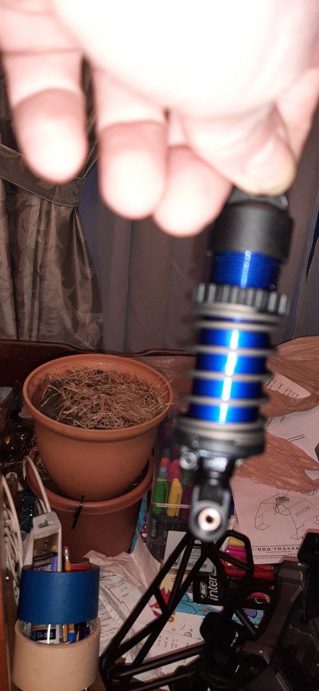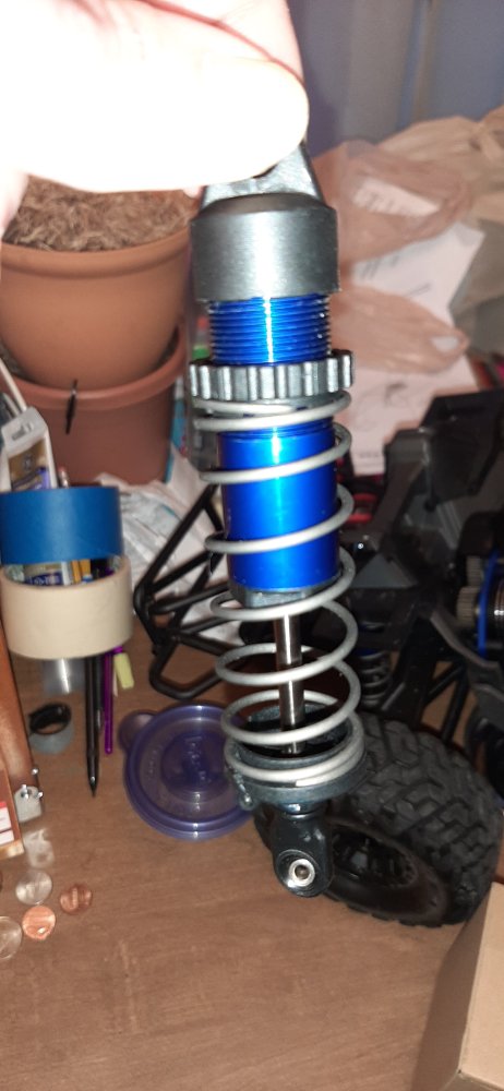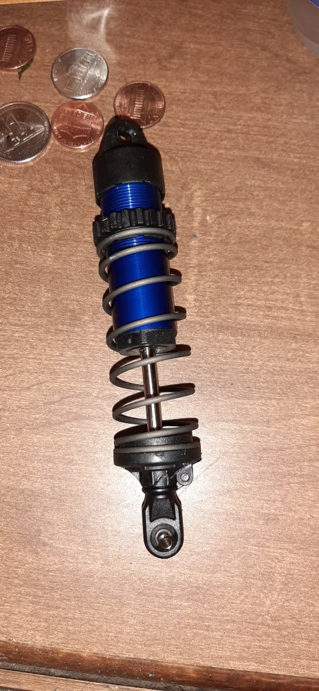 Now I'm positive that the spring should push that shock out with no weight on it but not so much with a bent shaft. Ordered up 4 shocks to change the color of them to green as I'll do green on the chassis and blue body, for now, but at $129 for a new unpainted body I'll hold off for a while on that one.