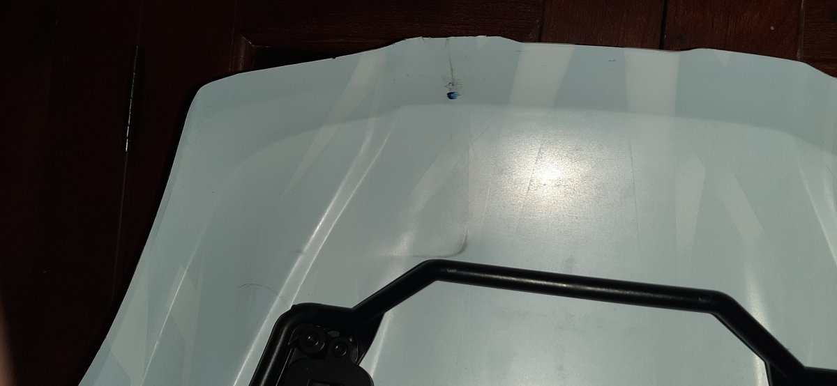 As you can see in the next set of pictures the body took a hard hit and it didn't help that I hit the dumpster right on the corner of it. There is a raised eye brow on the right side of the hood where the body got dented in. There is spot on the front where a crack is going to start because the body is gouged both on the inside and outside.
